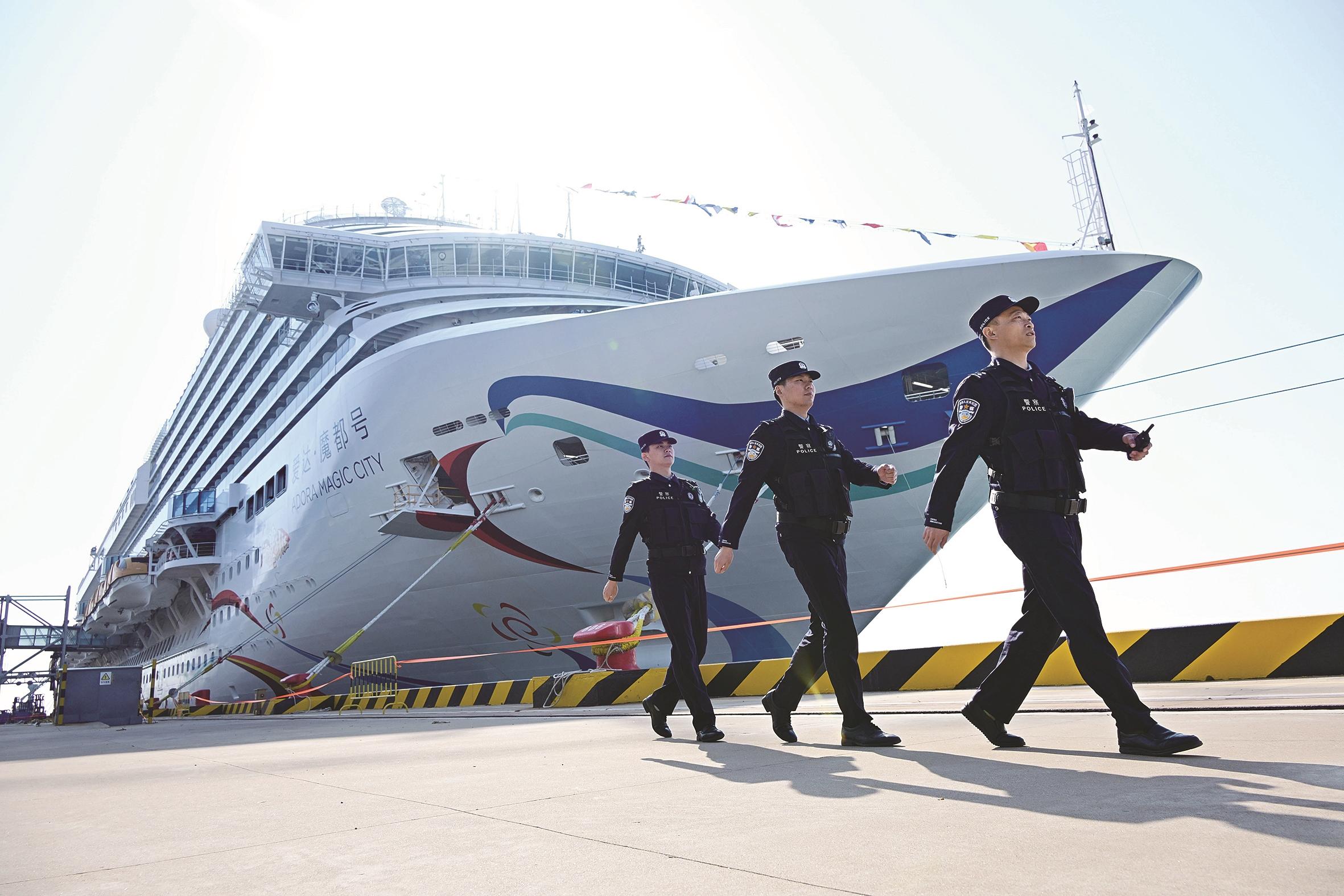 4月6日,在青岛邮轮母港码头,几名出入境边防检查站警官从“爱达·魔都号”邮轮旁经过。