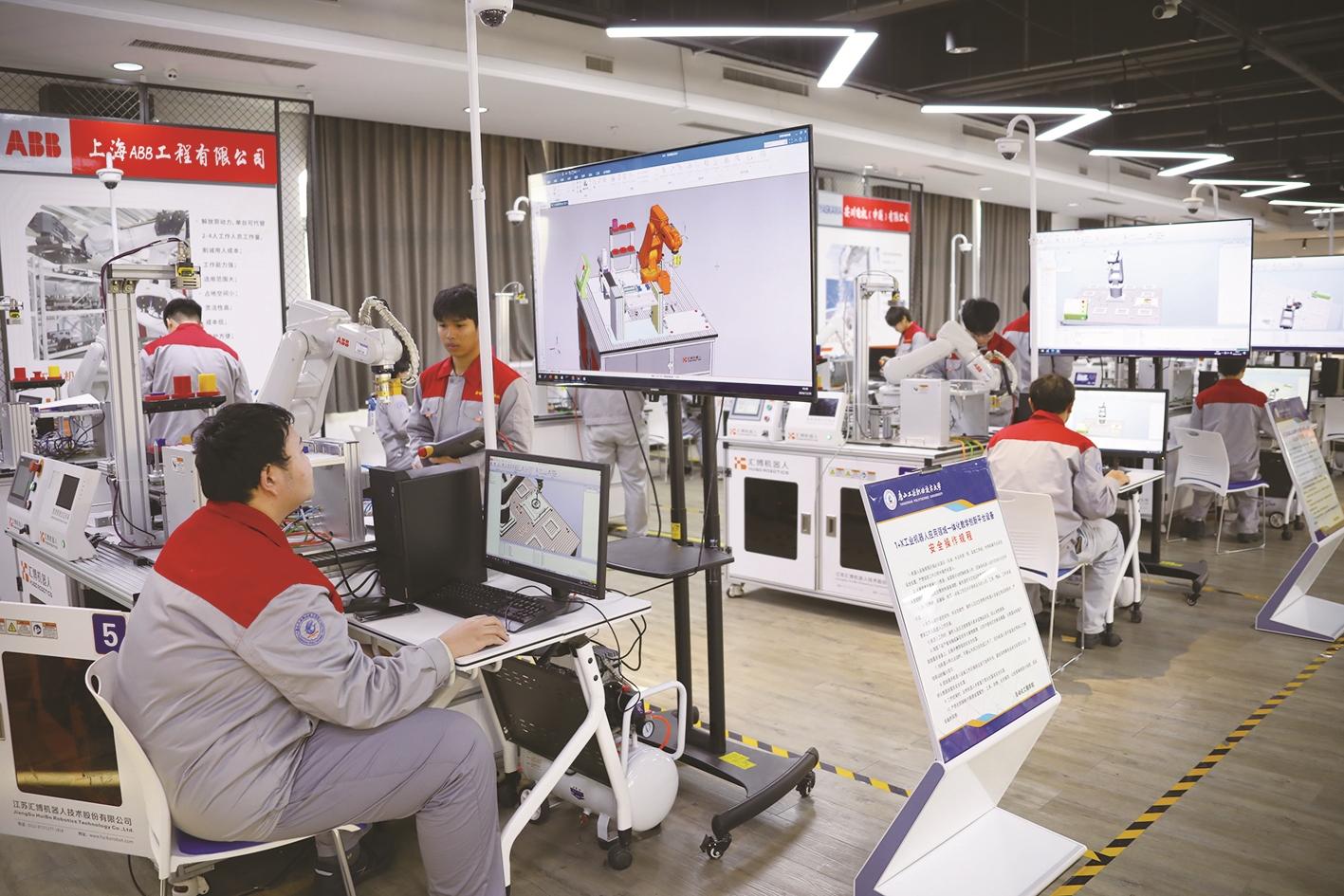 图为4月2日,学生们正在进行工业机器人实际操作训练。记者 景立华、杨海 摄