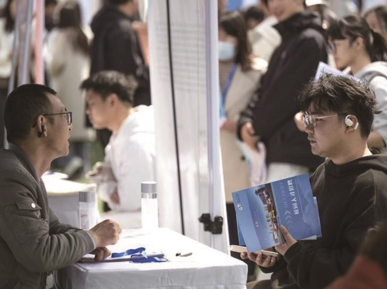 4月1日,求职者在湖北工业大学专场招聘活动现场了解岗位信息。