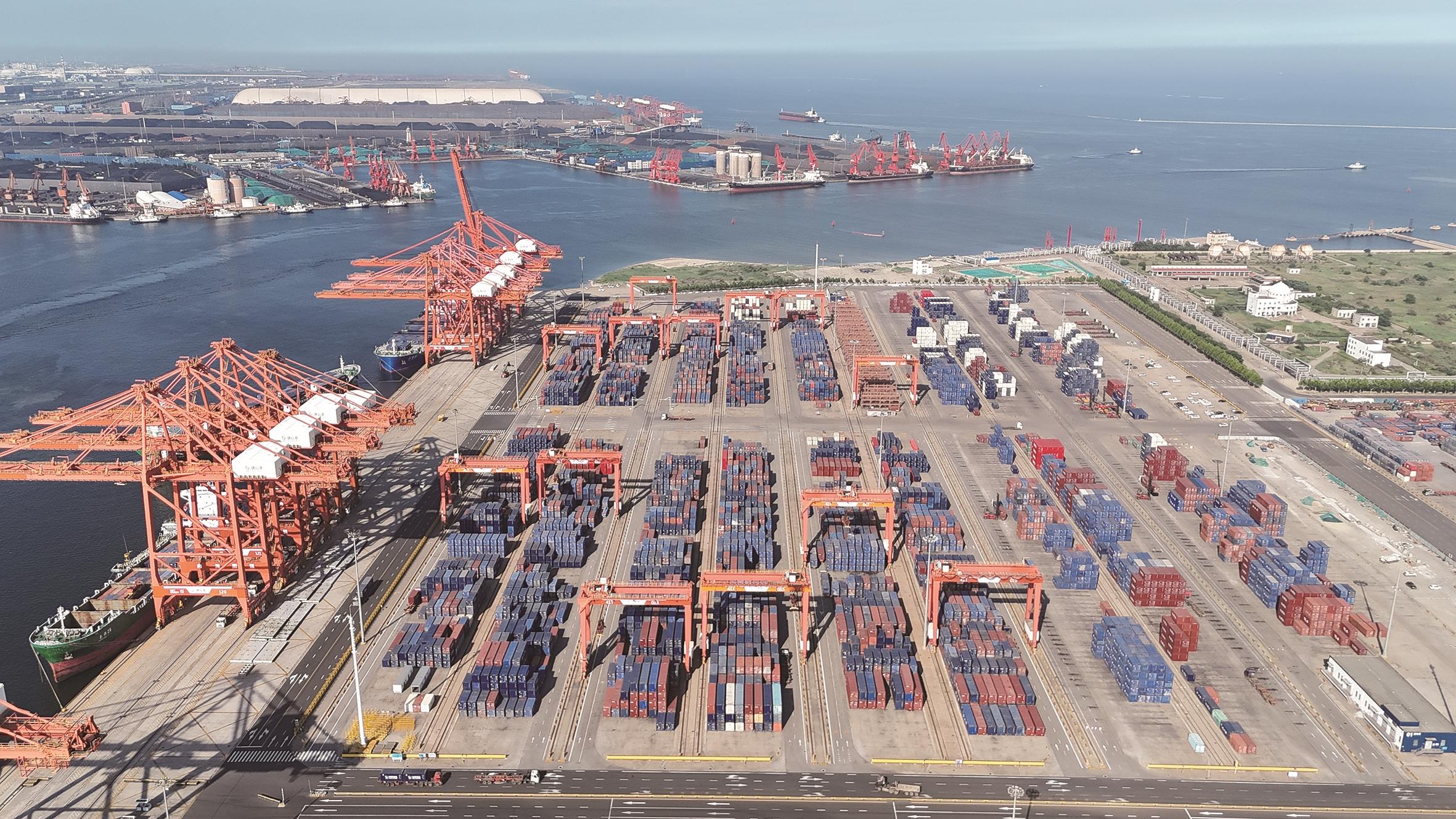 铜精矿建设现场热火朝天、电动车替代燃油车跑上疏港路、轨道吊司机稳坐办公室“遥控”集装箱灵活“就位”,集装箱班轮准点启程驶向东北亚港口……