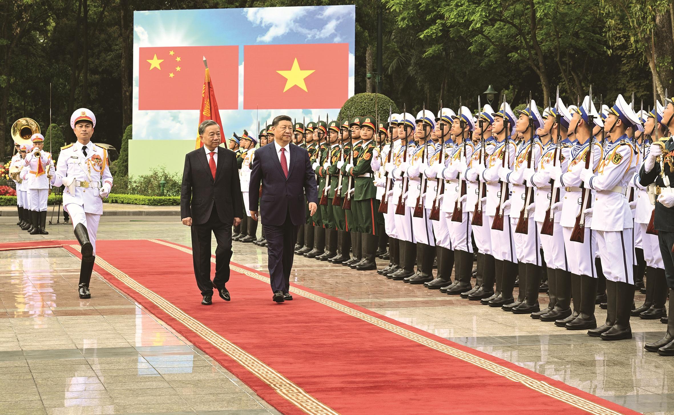 习近平乘车抵达时,苏林在下车处热情迎接,越南少年儿童向习近平献花。习近平同苏林一同登上检阅台。军乐团奏中越两国国歌,鸣礼炮21响。习近平在苏林陪同下检阅仪仗队。两党总书记分别同对方陪同人员握手致意,随后一同观看分列式。