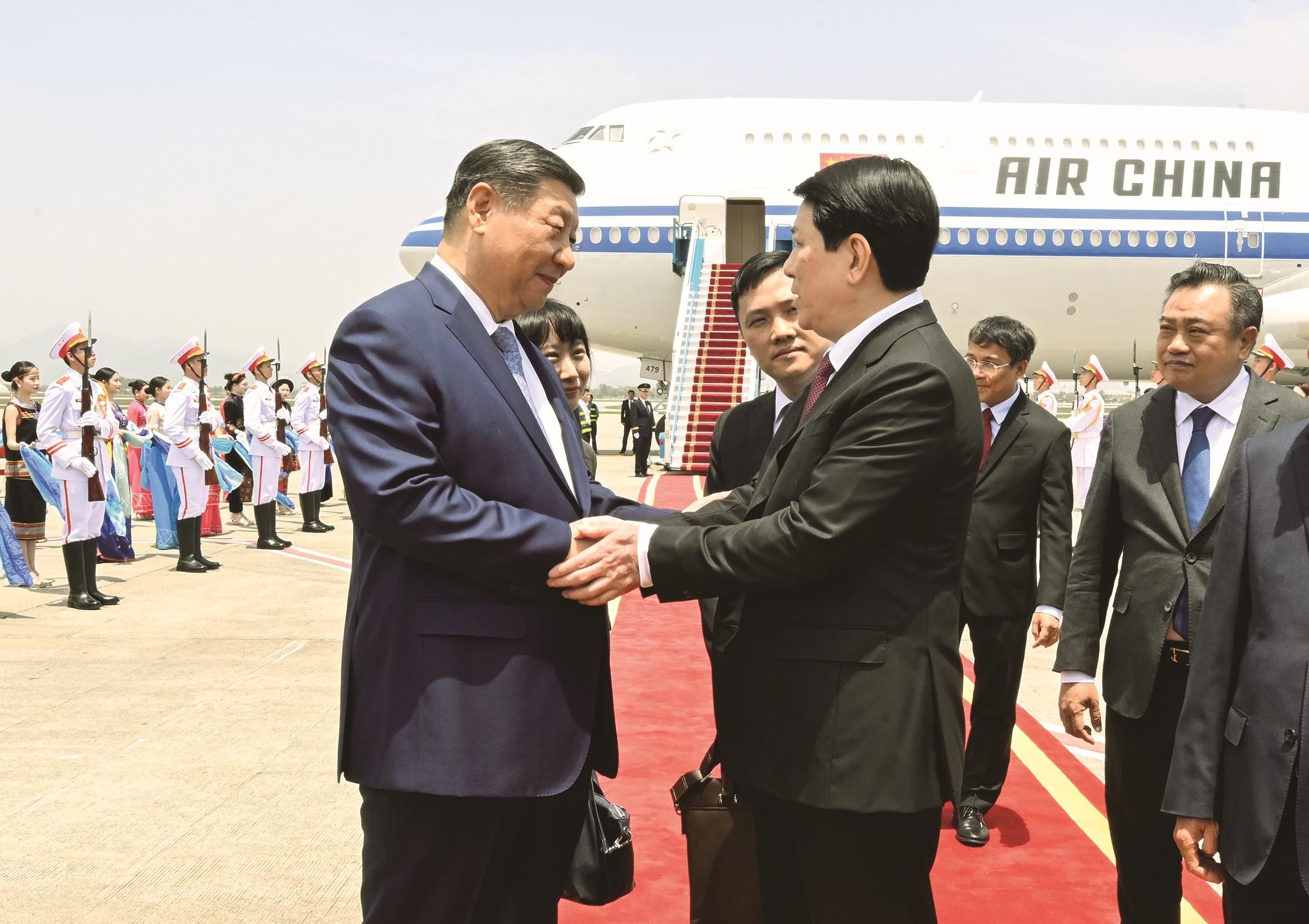 当地时间4月14日中午,中共中央总书记、国家主席习近平乘专机抵达河内,对越南进行国事访问。习近平乘专机抵达河内内排国际机场时,越南国家主席梁强等越南党政领导人和地方代表热情迎接。新华社记者 李学仁 摄