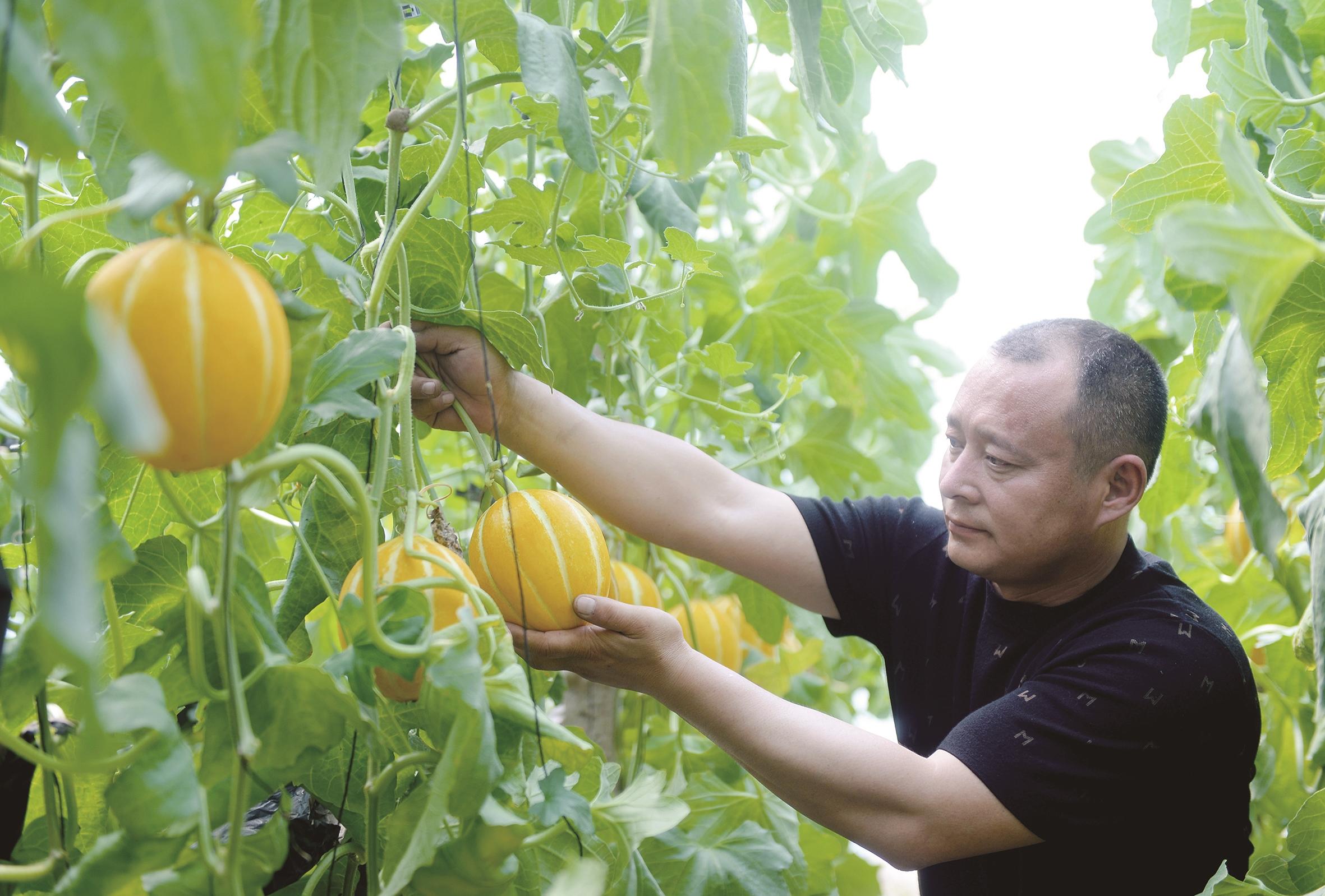 图为戴海龙采摘“丰雷”甜瓜。