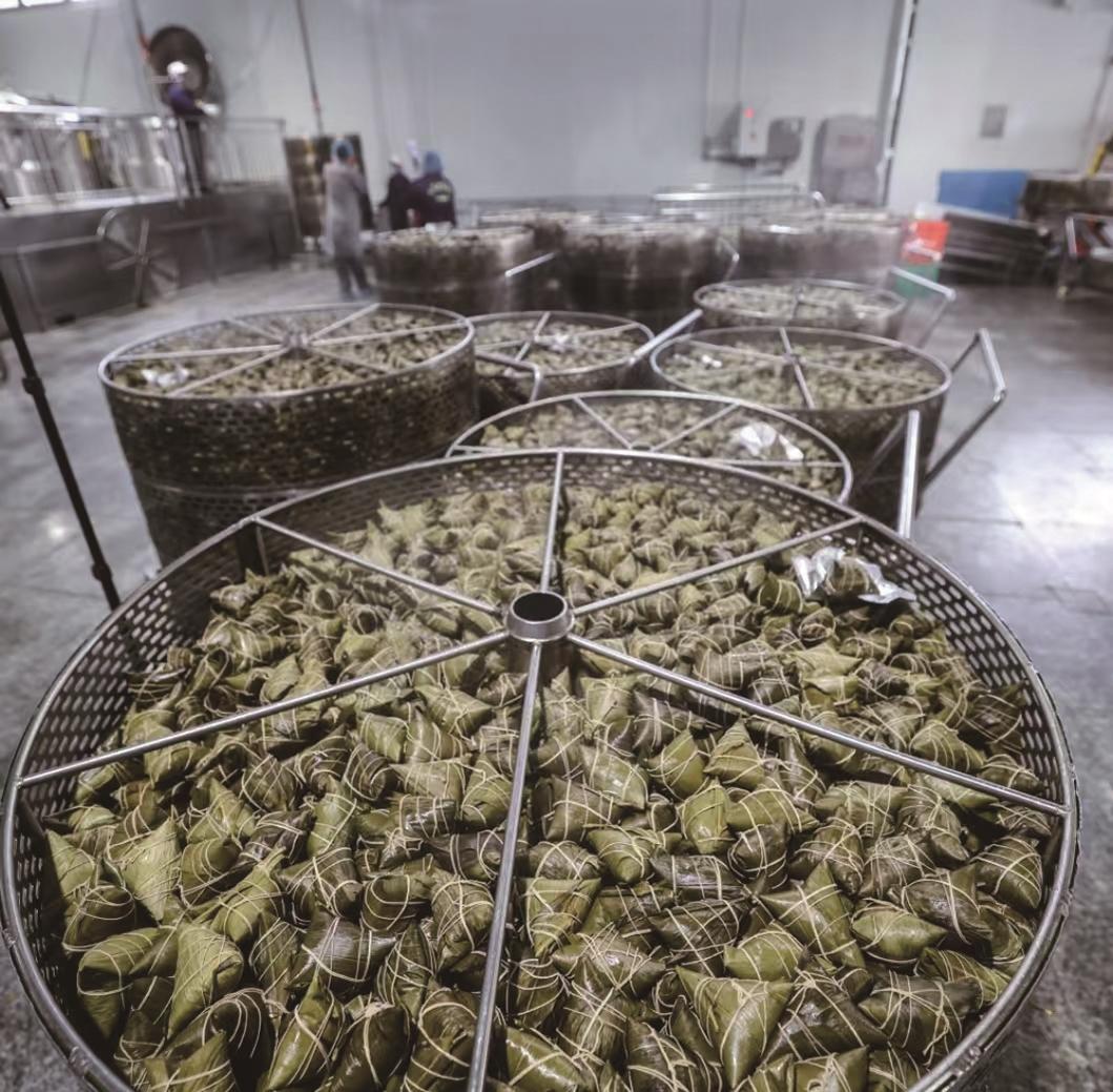 4月16日,在位于嘉兴南湖区湘家荡农业加工园的老字号企业南湖斋食品股份有限公司煮粽车间内,工人操作数字化煮粽系统煮粽子,每个大锅一次可以煮约5000个粽子。