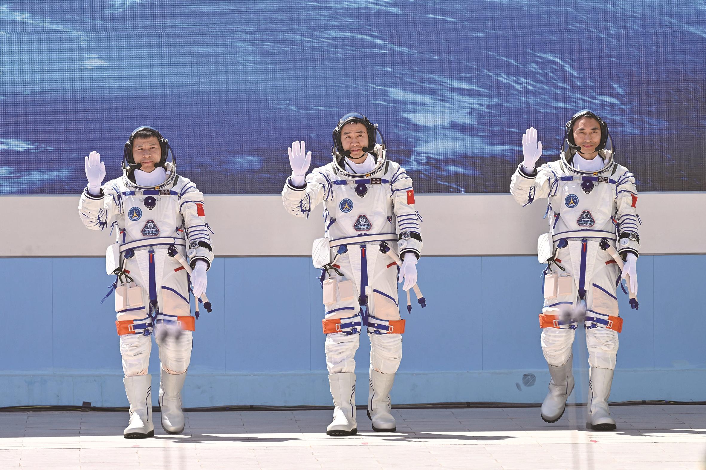 四月二十四日,神舟二十号载人飞行任务航天员乘组出征仪式在酒泉卫星发射中心问天阁圆梦园广场举行。这是航天员陈冬(中)、陈中瑞(右)、王杰在出征仪式上。 新华社记者 李鑫 摄