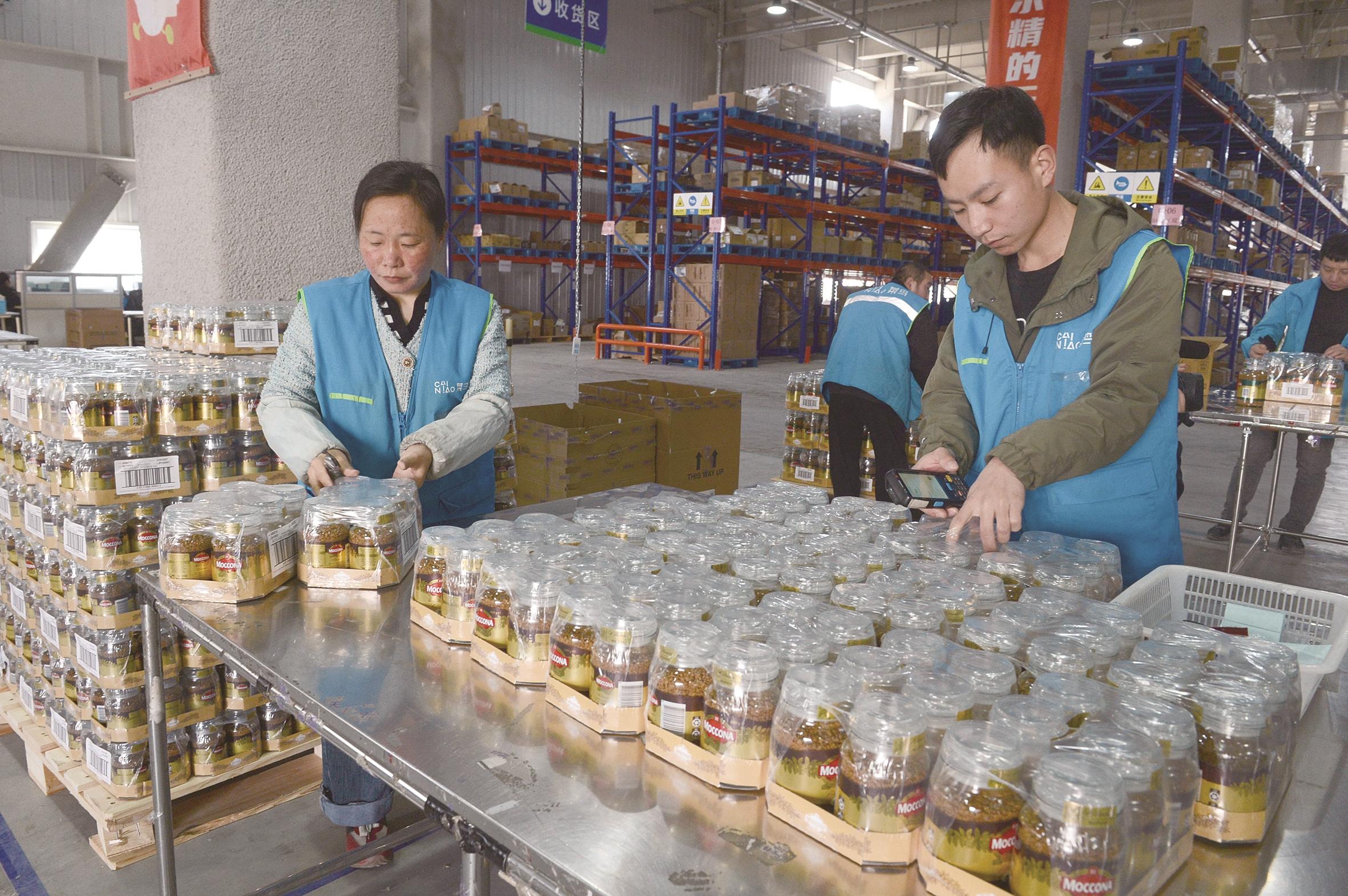 图为工作人员在收货区整理货物。本报记者 吕光宇 摄