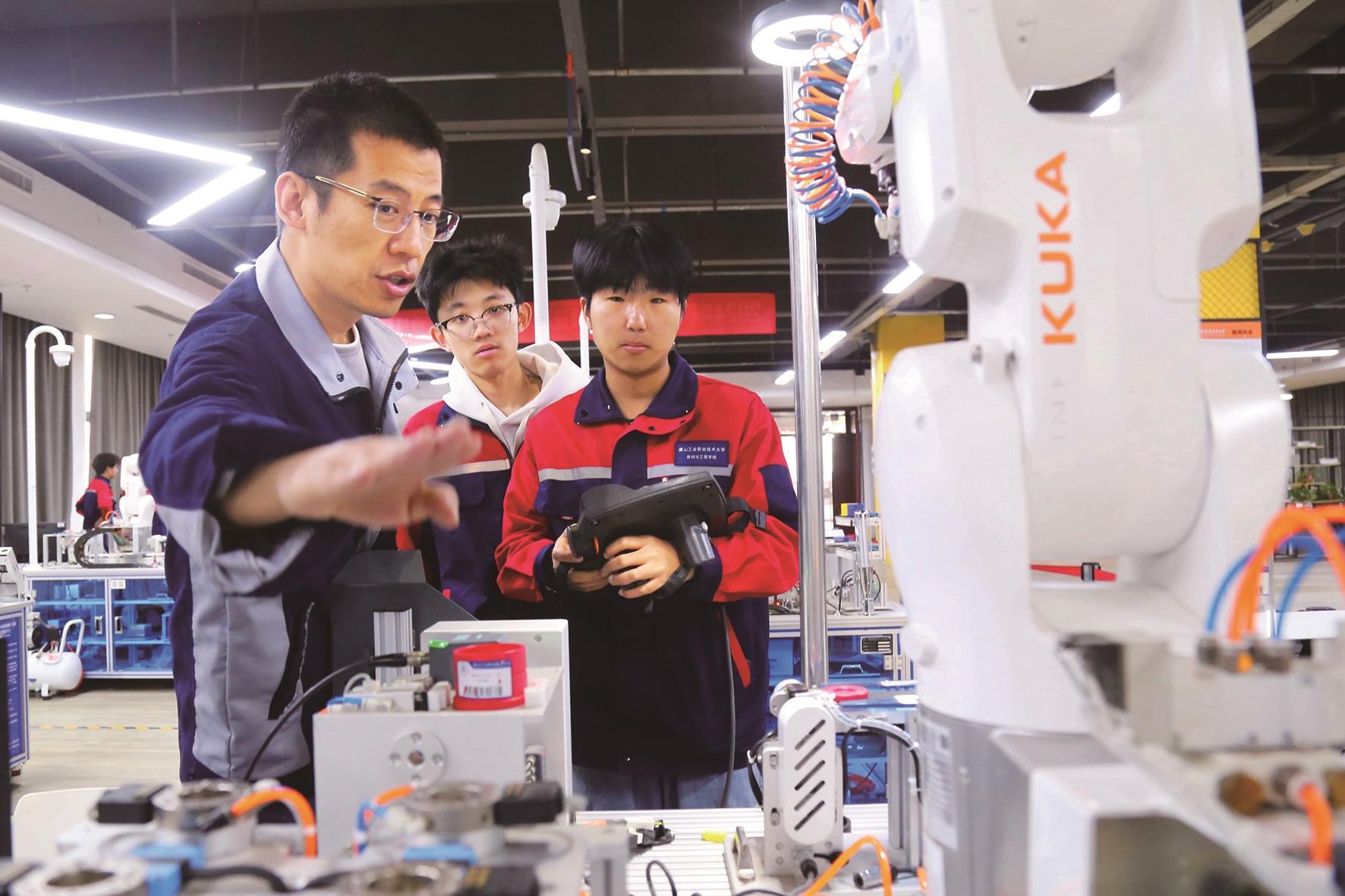 ?唐山工业职业技术大学自动化工程学院教师正在指导学生操作1+X工业机器人应用领域一体化教学平台设备。 记者 刘大民 摄