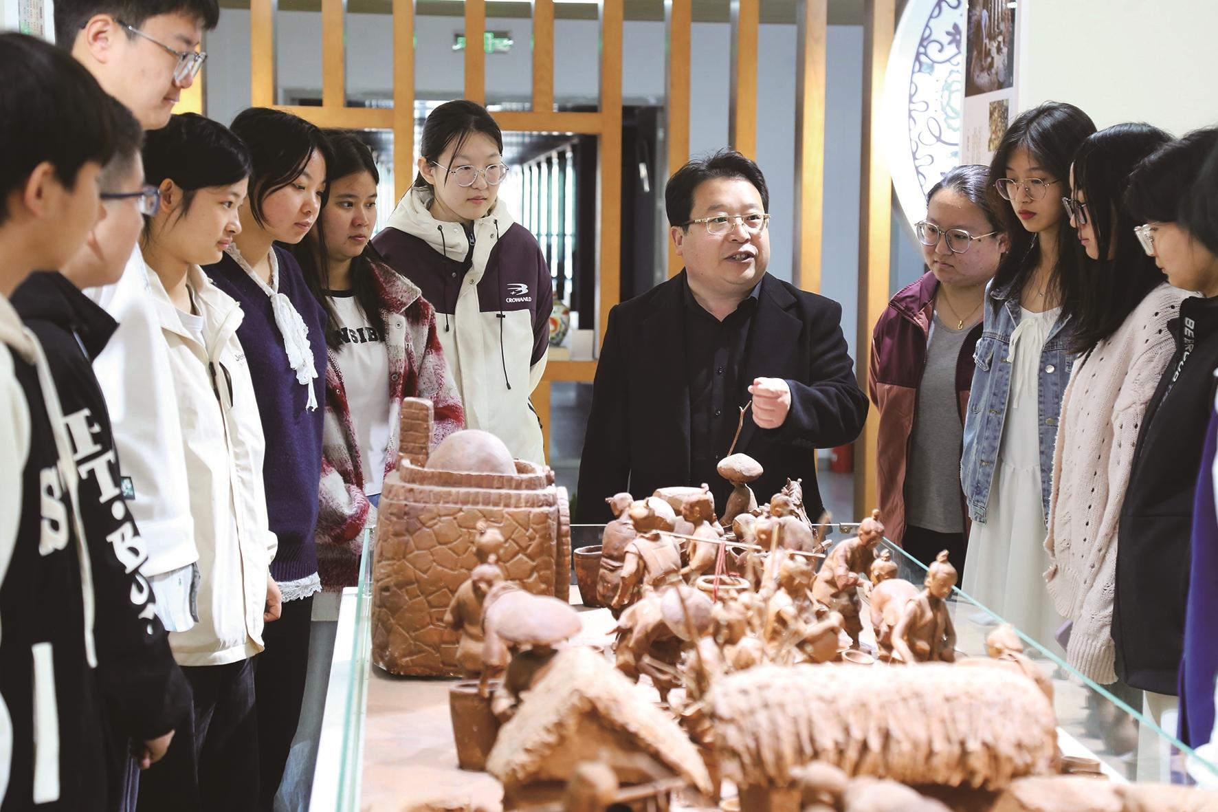 ▲在唐山工业职业技术大学陶瓷非遗文化传承基地,陶瓷设计与工艺专业教师正给学生讲解陶瓷历史。 记者 刘大民 摄