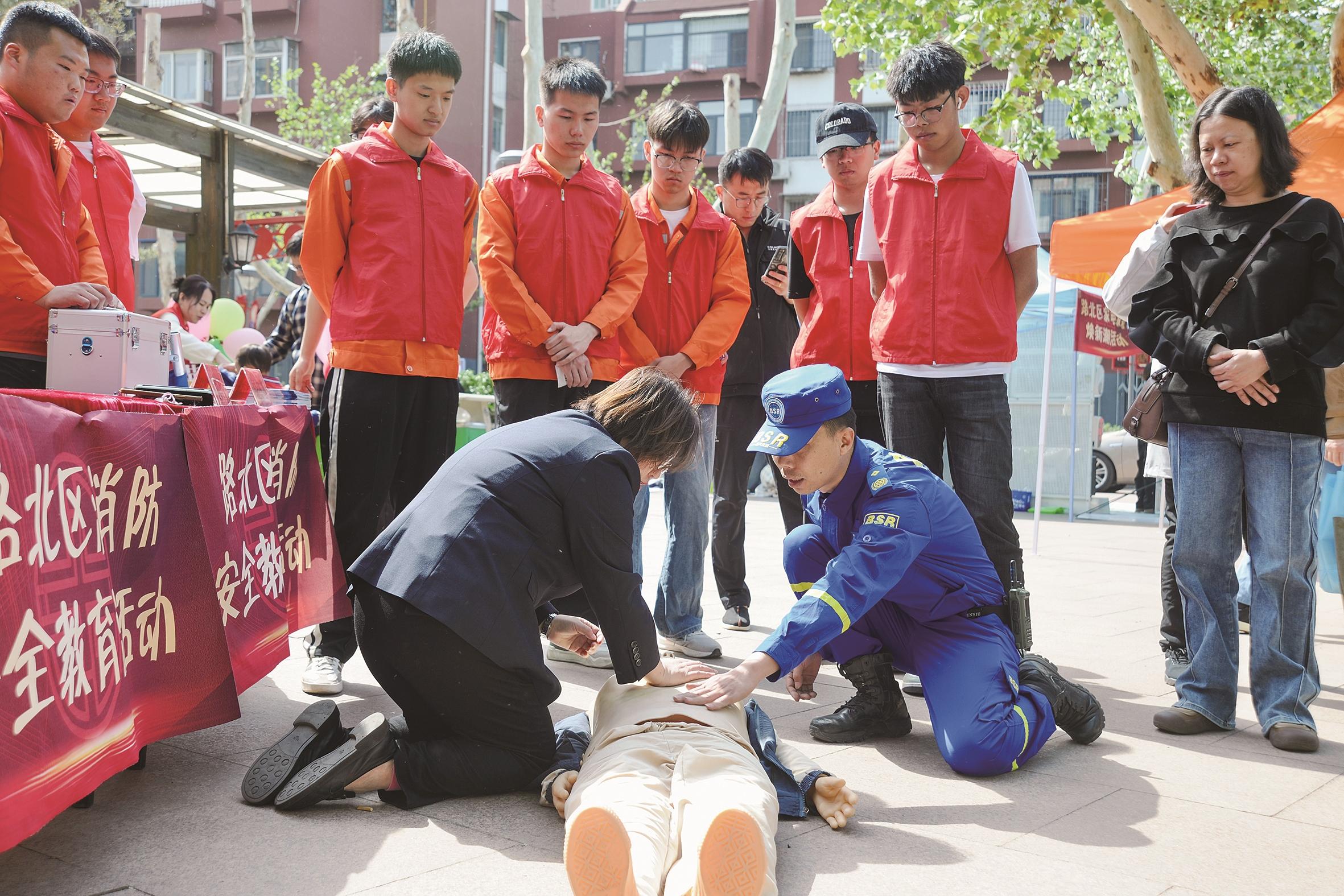 “五一”假期,路北区精心策划的新时代邻里节、我在新时代文明实践中心过“五一”等系列活动精彩纷呈,为市民带来丰富体验。 图为光明街道光明西里甲区社区广场上,市民在蓝天救援队队员的指导下学习心肺复苏操作。 本报记者 徐慧 摄