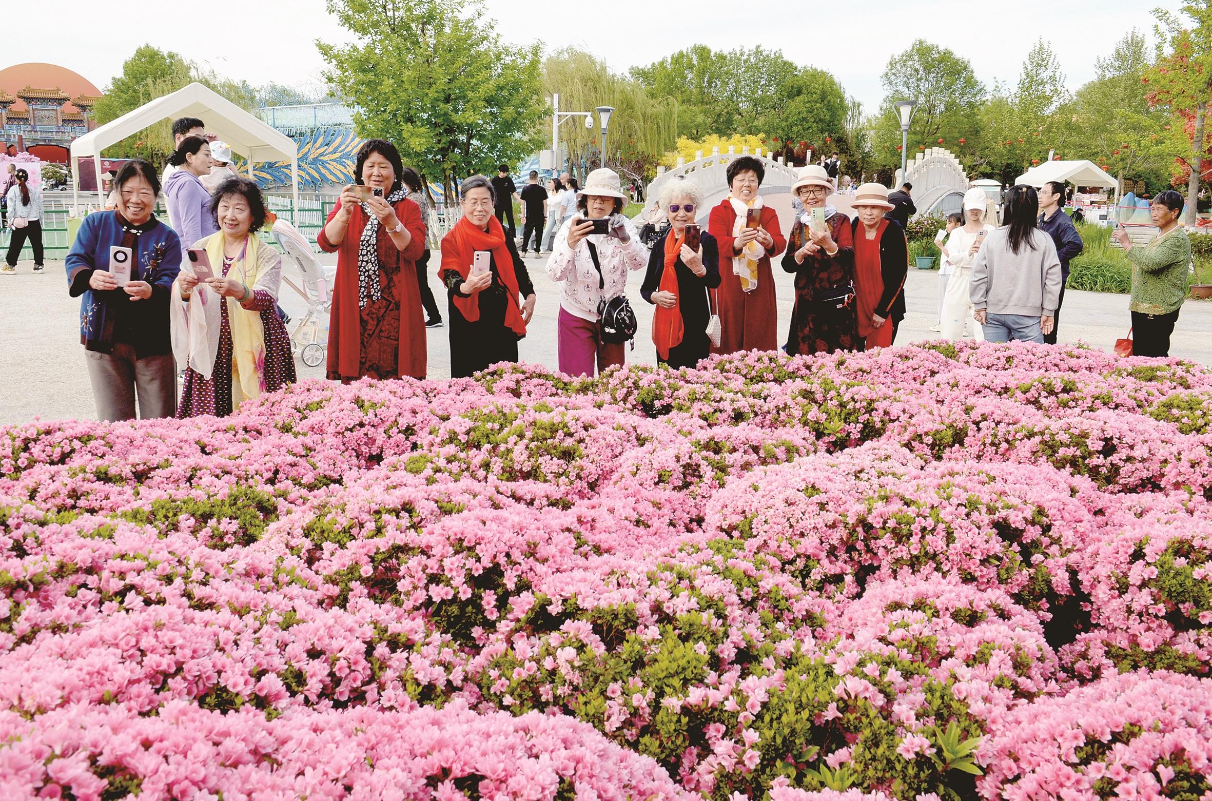 图为杜鹃花吸引了许多游客前来打卡拍照。