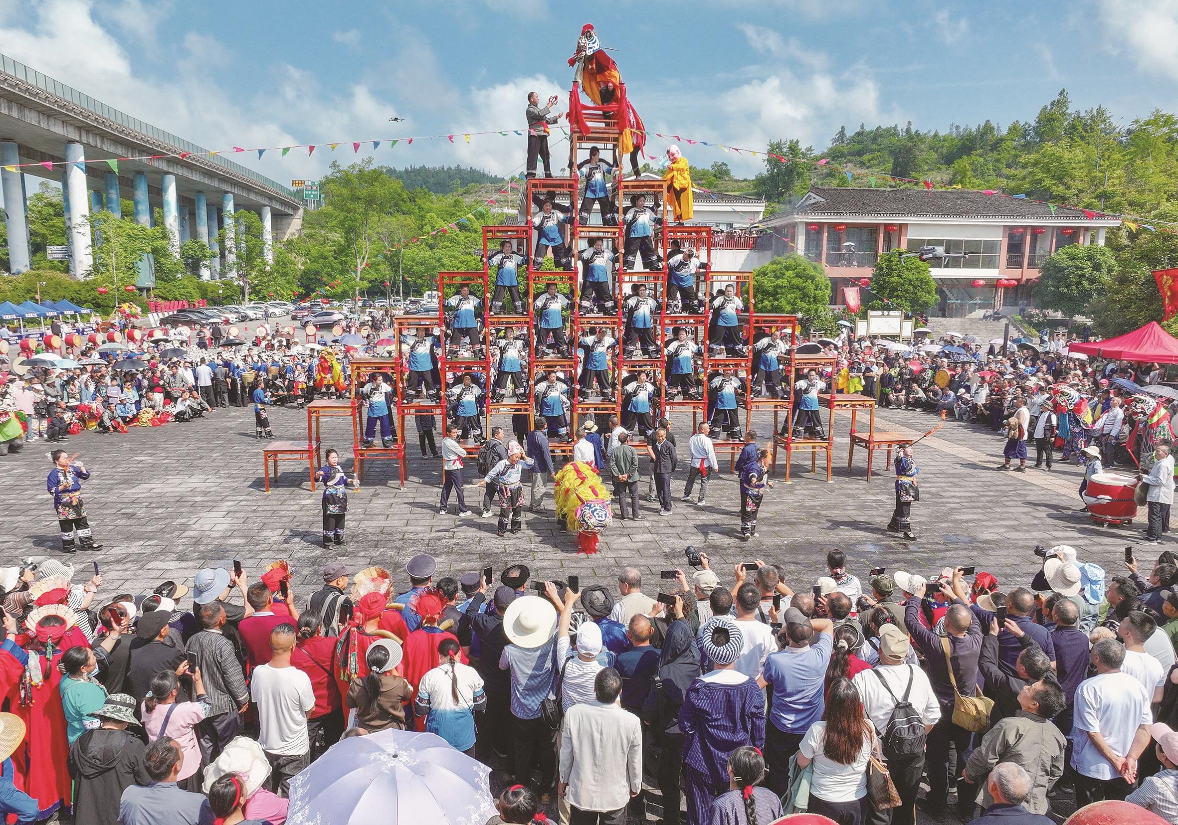 5月5日,在湖南省湘西土家族苗族自治州吉首市,民间艺人为游客表演狮子登高。
