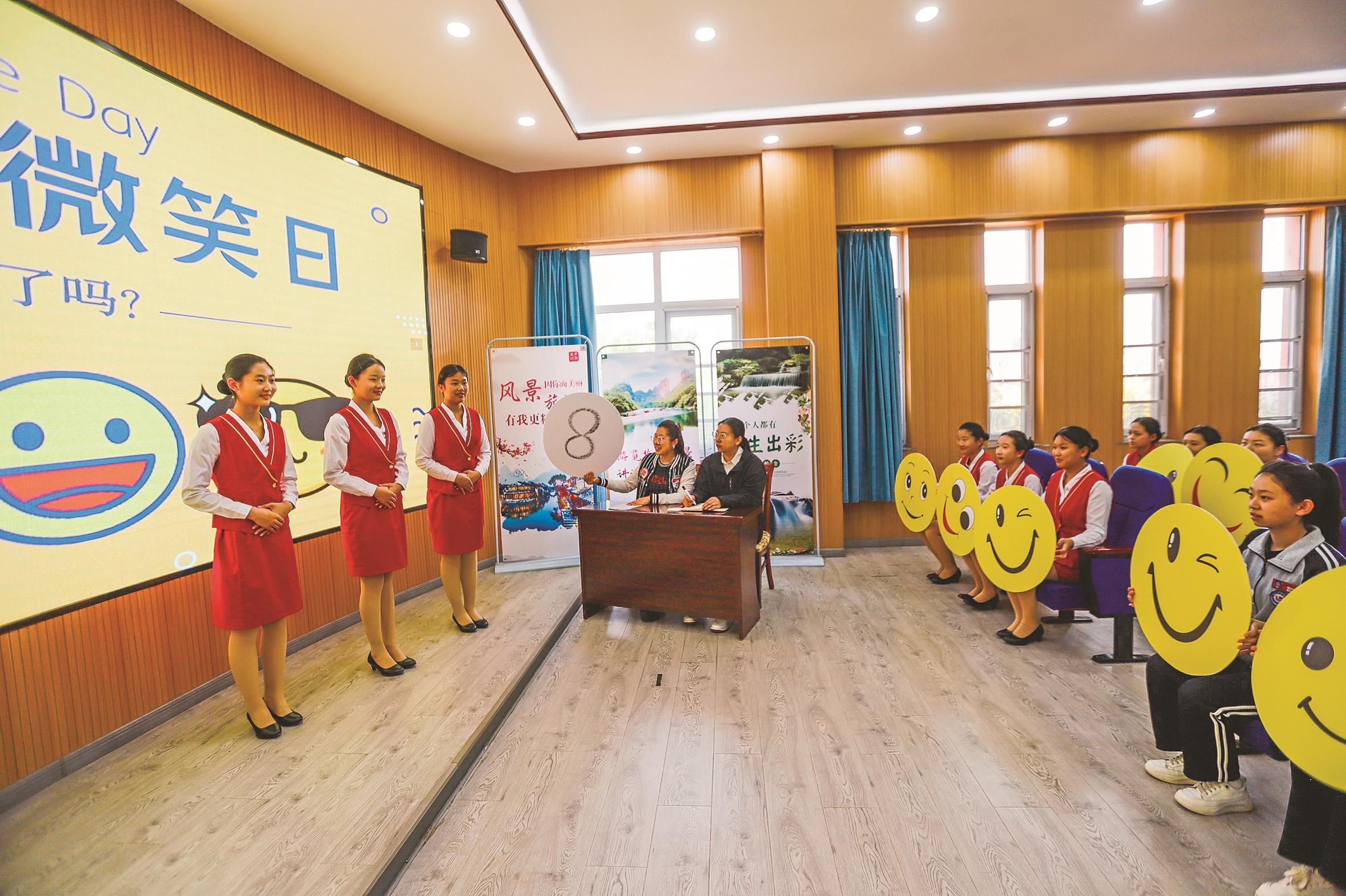 5月7日,河北省遵化市职教中心旅游专业的学生在参加微笑礼仪展示活动。