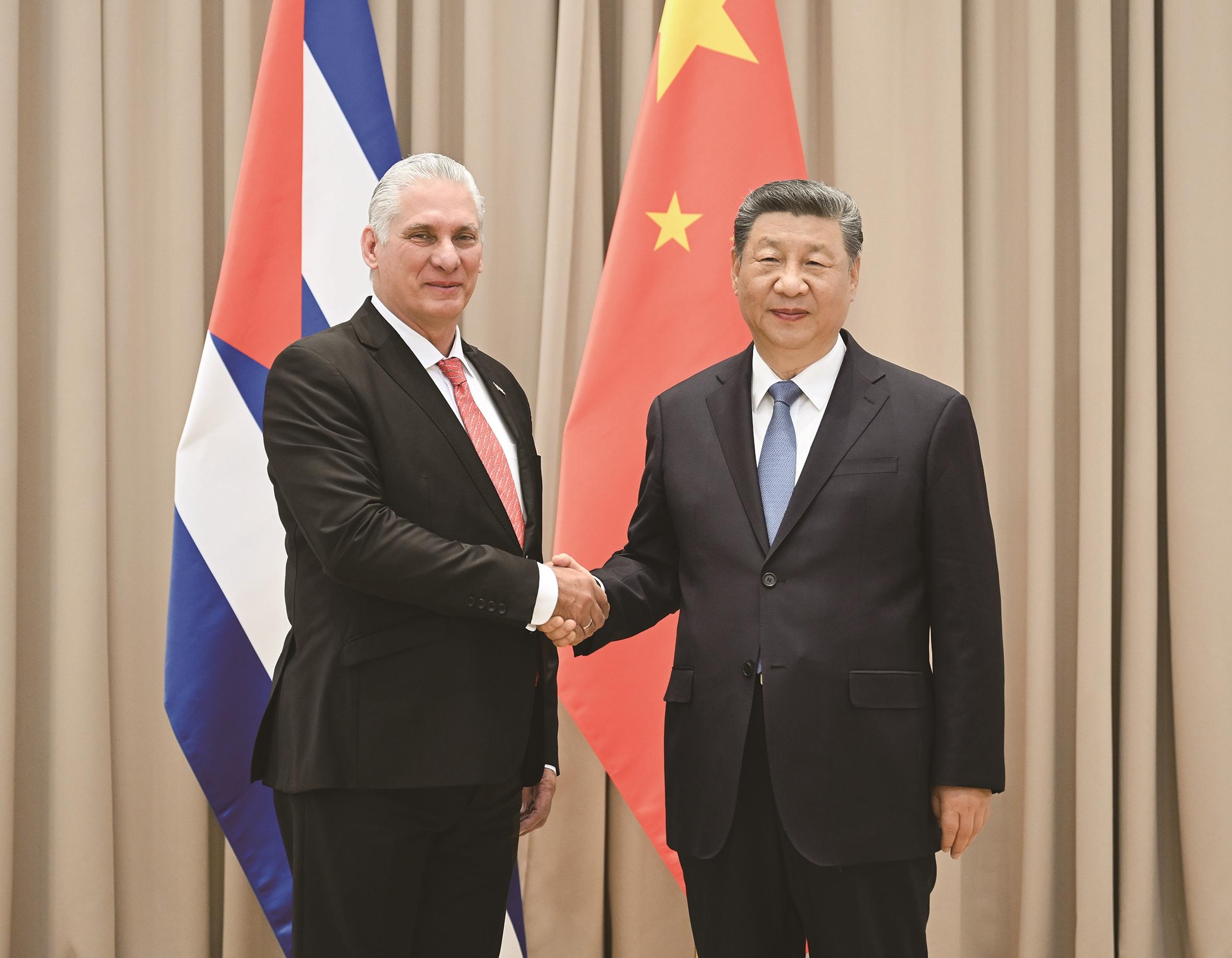 习近平指出,近年来,我同主席同志多次会晤,共同引领中古关系进入政治互信更深厚、战略协作更紧密、民意基础更牢固的新阶段。今年是中古建交65周年,中方愿同古方进一步巩固铁杆情谊,构建更加紧密的中古命运共同体,树立社会主义国家团结合作、发展中国家真诚互助的典范。双方要促进各层级交往、各领域合作进一步走深走实,让高水平政治互信始终成为中古两党两国关系的鲜明标识。中方坚定支持古巴捍卫国家主权、反对外来干涉和封锁,支持古巴经济社会发展。作为全球南方重要成员,双方要在金砖、中拉论坛等框架内加强协调和配合,反对强权政治和单边霸凌,维护国际公平正义。