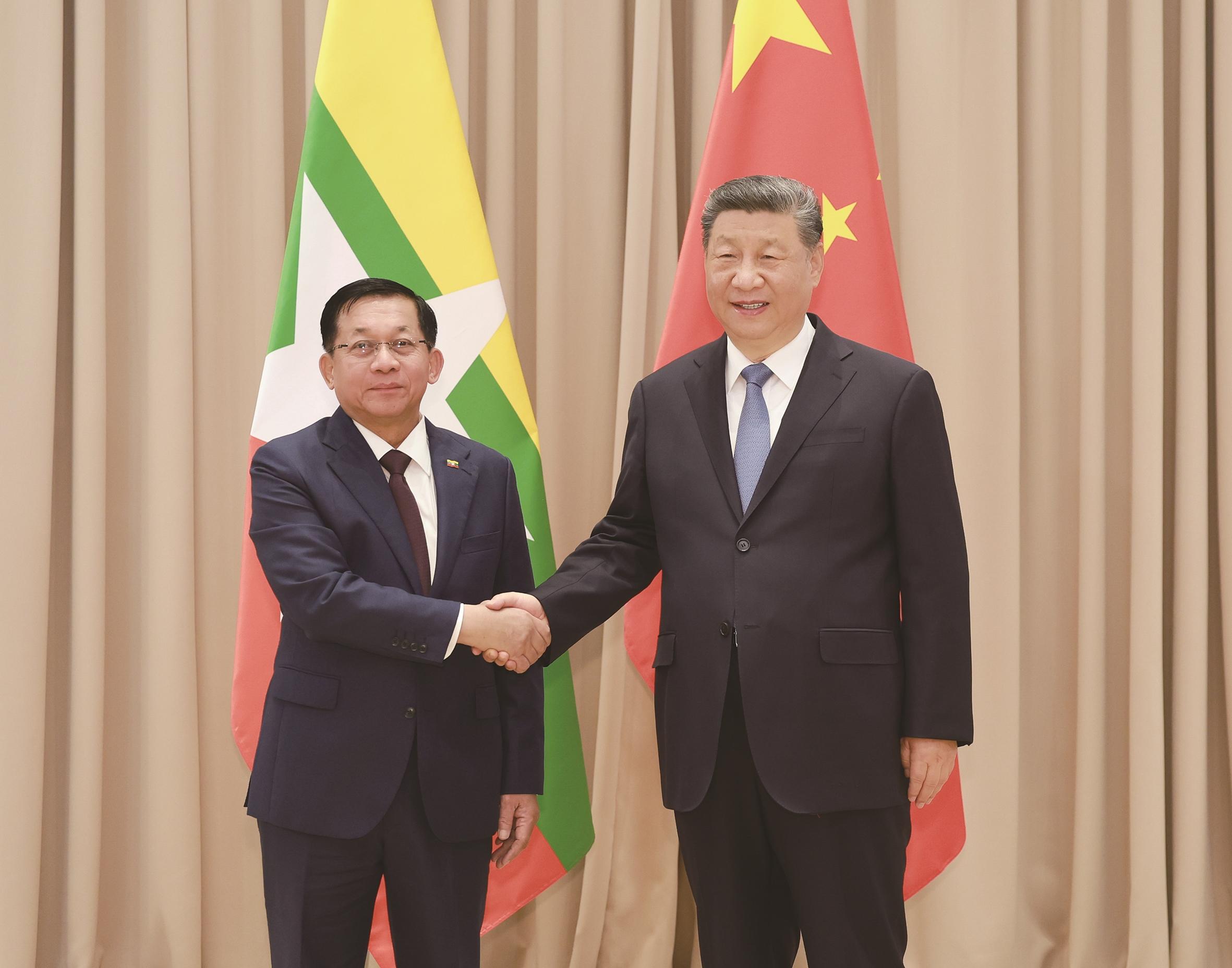 习近平指出,中缅是同甘共苦、守望相助的命运共同体。中缅两国共同倡导的和平共处五项原则和万隆精神历久弥坚,时代价值不断凸显。今年是两国建交75周年,中方将秉持睦邻、安邻、富邻、亲诚惠容、命运与共的理念方针,同缅方深化命运共同体建设,高质量共建“一带一路”,落实好全球发展倡议、全球安全倡议、全球文明倡议,给两国人民带来更多福祉。前不久,缅甸曼德勒强烈地震造成重大人员伤亡和财产损失,中方最早派出救援力量,援助紧急人道主义物资,愿继续提供帮助,支持缅方重建家园。中方支持缅甸走符合本国国情的发展道路,维护主权独立、领土完整、国家稳定,稳妥推进国内政治议程。双方要深化战略合作,持续推进中缅经济走廊重点项目建设。希望缅方切实保障在缅中方人员、机构、项目安全,加力打击网赌电诈等跨境犯罪。双方要共同捍卫以联合国为核心的国际体系和以国际法为基础的国际秩序,维护发展中国家正当权益。