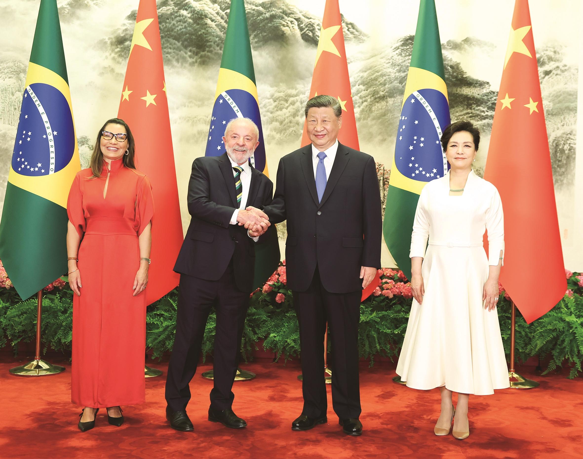 五月十三日下午,国家主席习近平在北京人民大会堂同来华进行国事访问的巴西总统卢拉举行会谈。这是习近平和夫人彭丽媛同卢拉和夫人罗桑热拉合影。新华社记者 黄敬文 摄