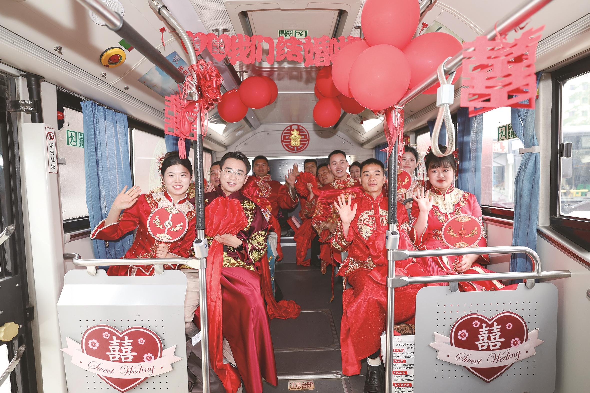 5月17日,在湖北省襄阳市公交集团三分公司停车场,新人们准备乘坐公交婚车前往百对职工集体婚礼现场。