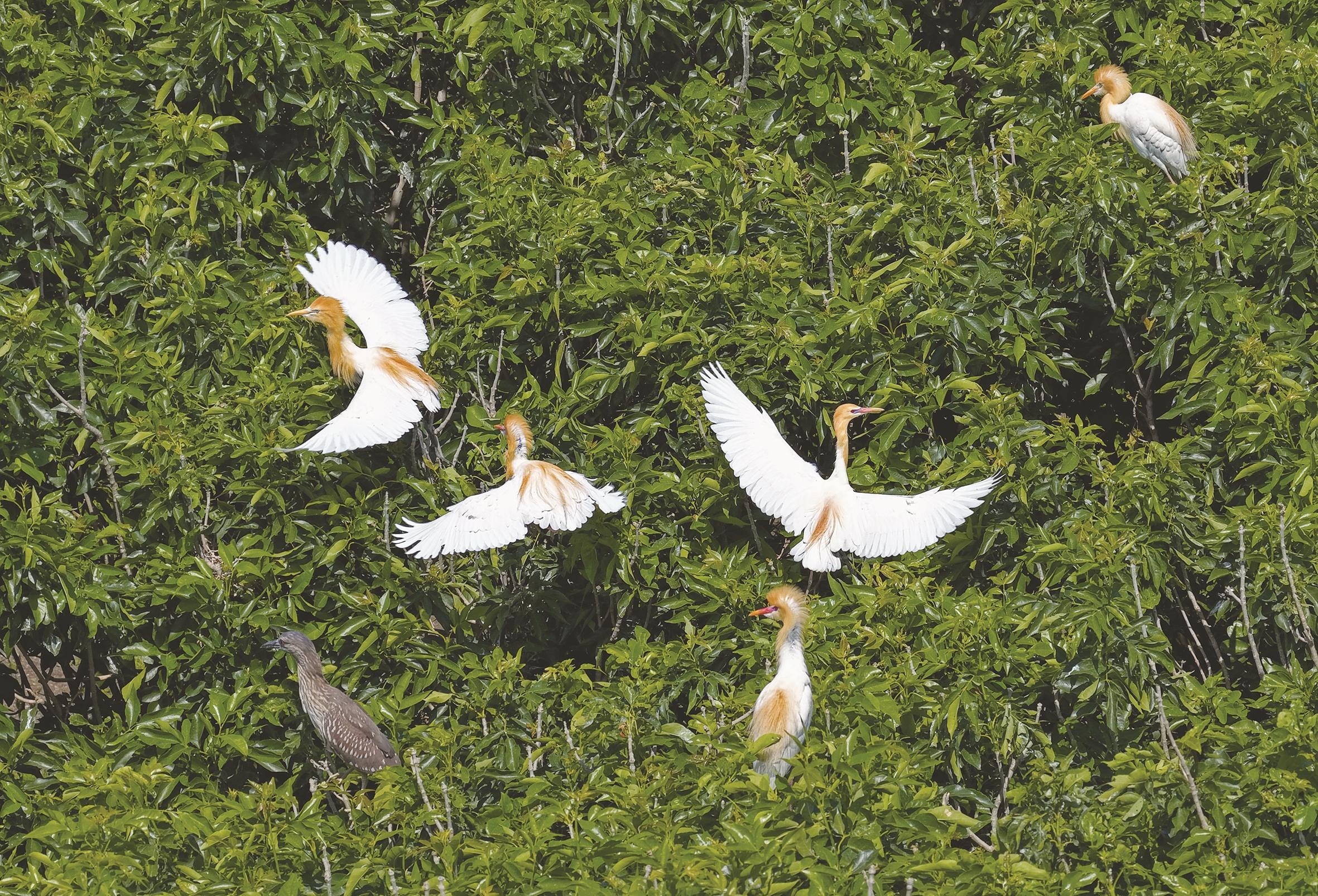 近日,河北省唐山市丰南区生态环境优良的沿海林地吸引了大批白鹭、牛背鹭、夜鹭和苍鹭等鹭科鸟类在此栖息繁衍,绘就出一幅幅优美和谐的生态画卷。