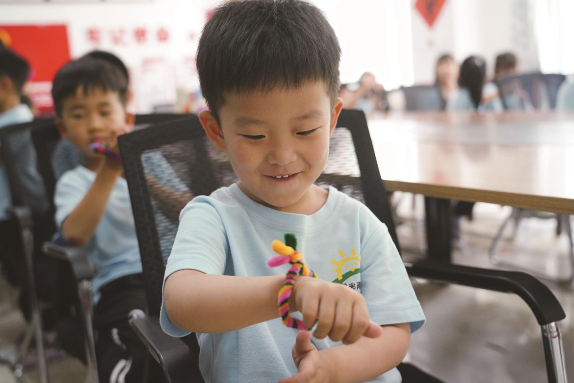 图为东城景苑社区小朋友展示制作好的五彩绳。 马靖轶、江宏 摄