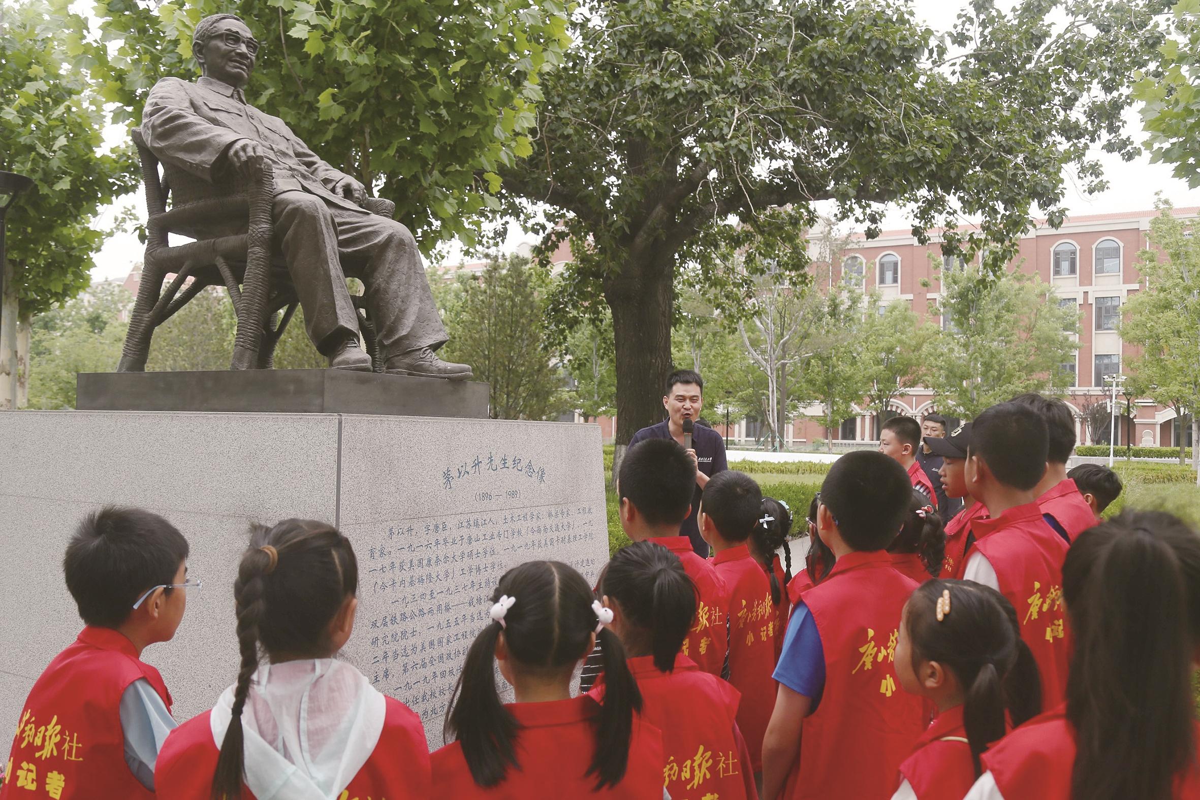上午9时,研究院古典优雅的牌坊式大门前,探访活动在小记者“探访老交大 逐梦少年行”的响亮口号中正式开启。“谁知道唐山在近代工业发展史上的‘七个中国第一’?”西南交通大学刘老师率先向小记者提出问题。“第一条标准轨距铁路”“第一台蒸汽机车”“第一件卫生陶瓷”……小记者们争相回答。“第一位本土大学教授罗忠忱在这所学校任教数十年。”刘老师的讲解让小记者对研究院有了更多的了解。