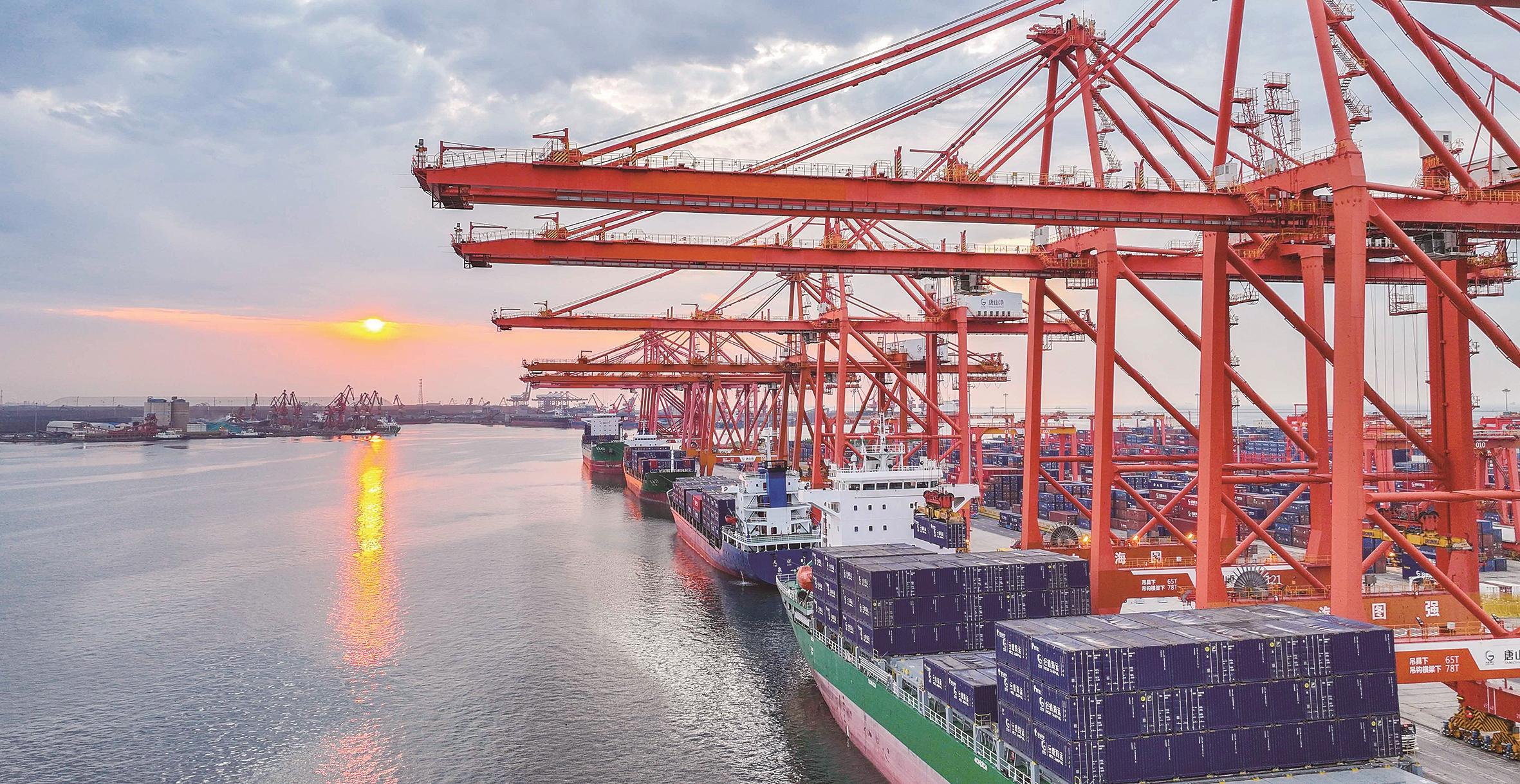 6月16日,轮船停泊在河北唐山港京唐港区集装箱码头作业(无人机照片)。5月份,全国规模以上工业增加值同比增长5.8%。