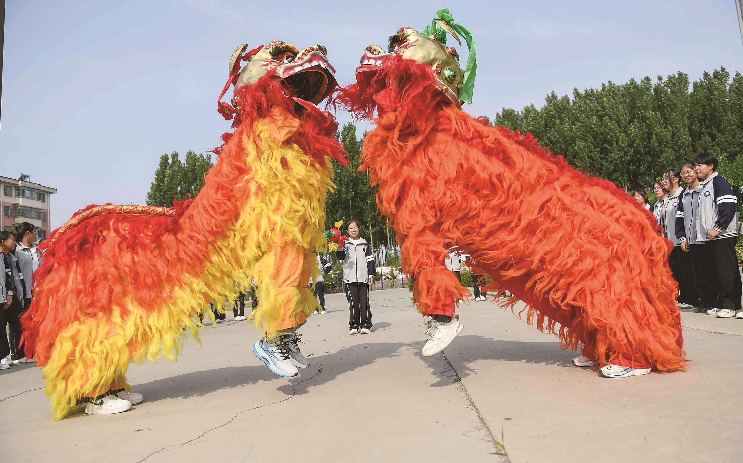 6月13日,河北省遵化市苏家洼镇下石河中学学生体验舞狮非遗项目。