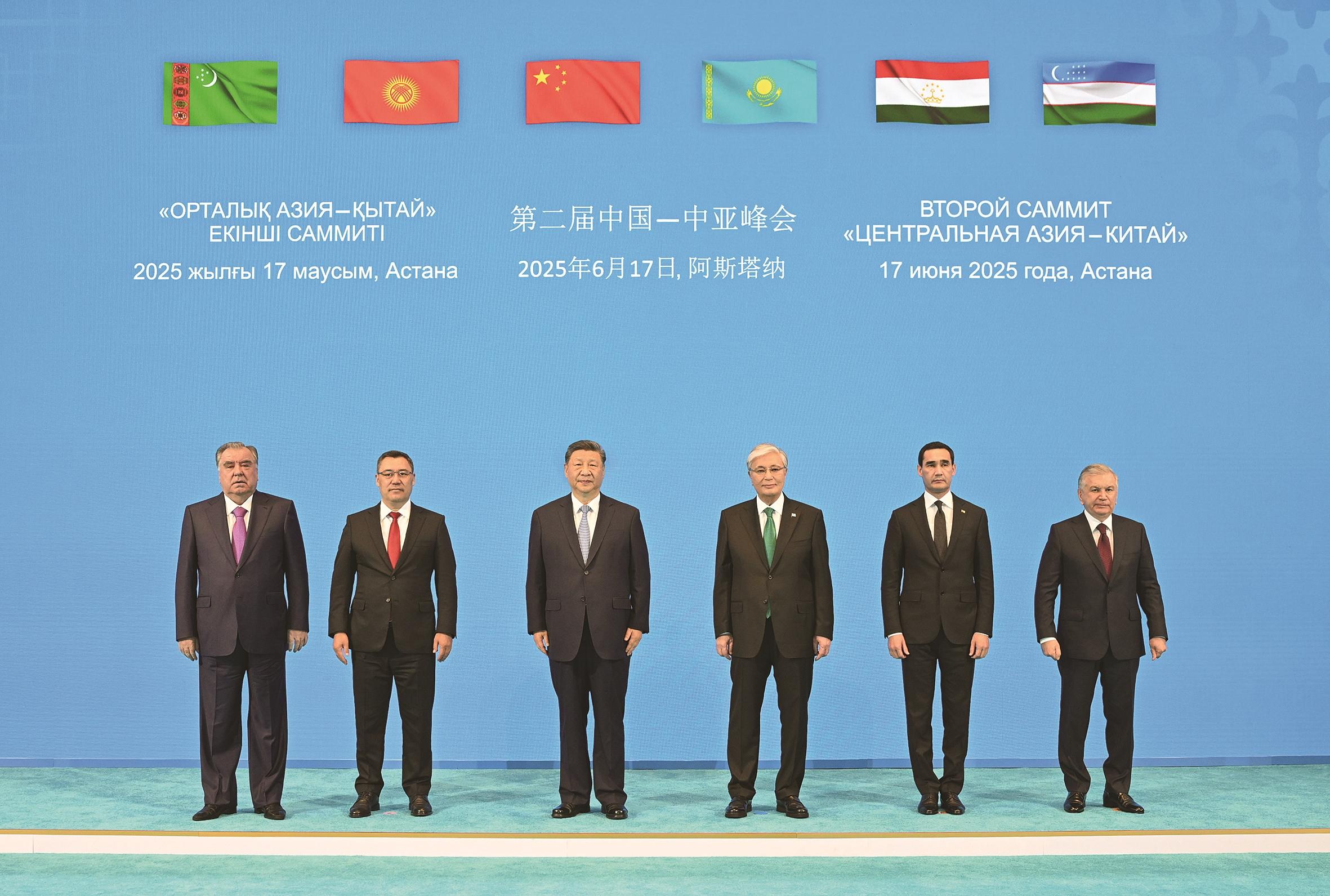 当地时间6月17日下午,第二届中国-中亚峰会在阿斯塔纳独立宫举行。哈萨克斯坦总统托卡耶夫主持会议。中国国家主席习近平、吉尔吉斯斯坦总统扎帕罗夫、塔吉克斯坦总统拉赫蒙、土库曼斯坦总统别尔德穆哈梅多夫、乌兹别克斯坦总统米尔济约耶夫出席。这是习近平同中亚五国元首集体合影。 新华社记者 谢环驰 摄