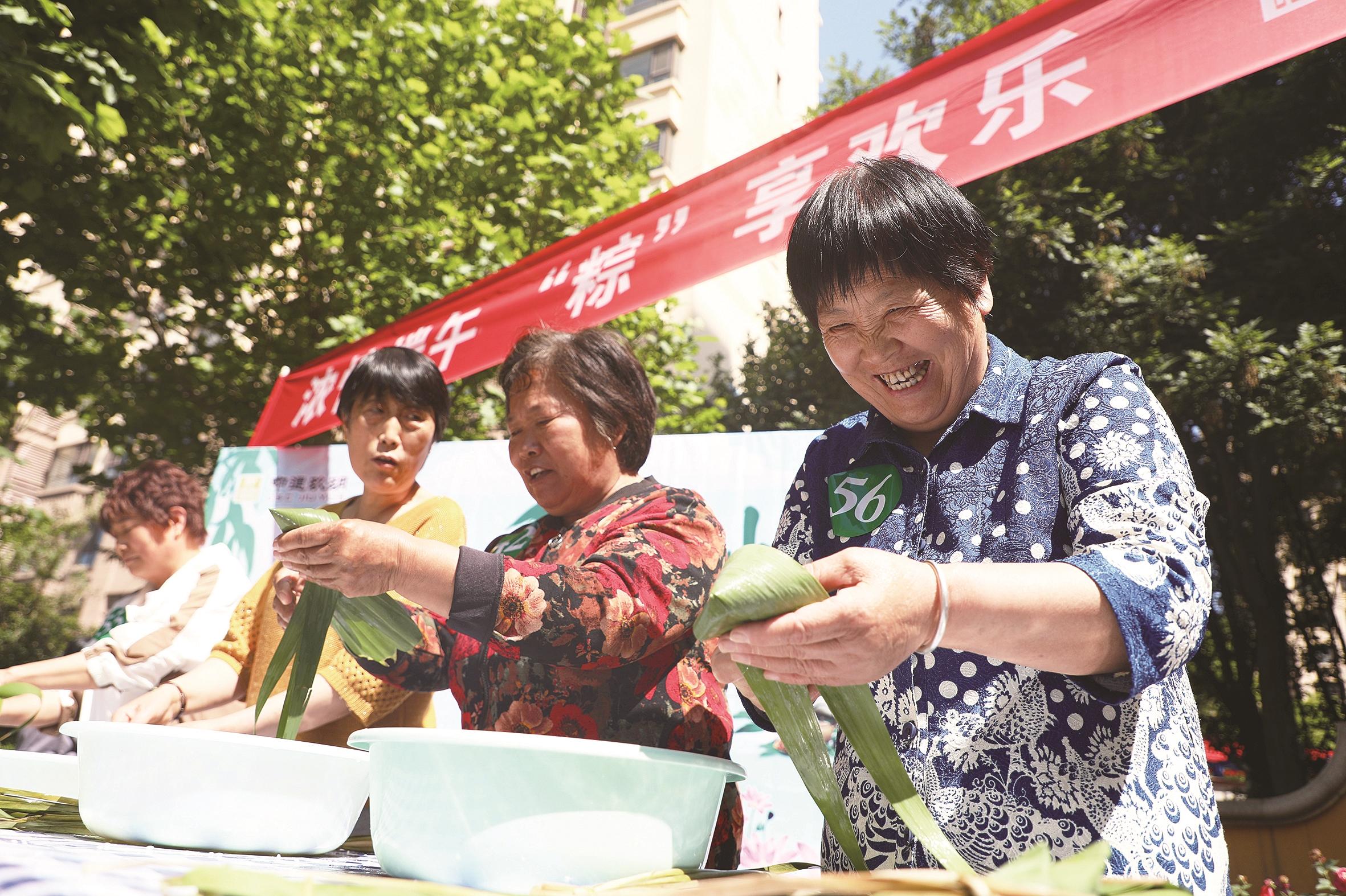 5月24日,在唐山市丰润区太平路街道中建城一社区,居民在参加包粽子比赛。