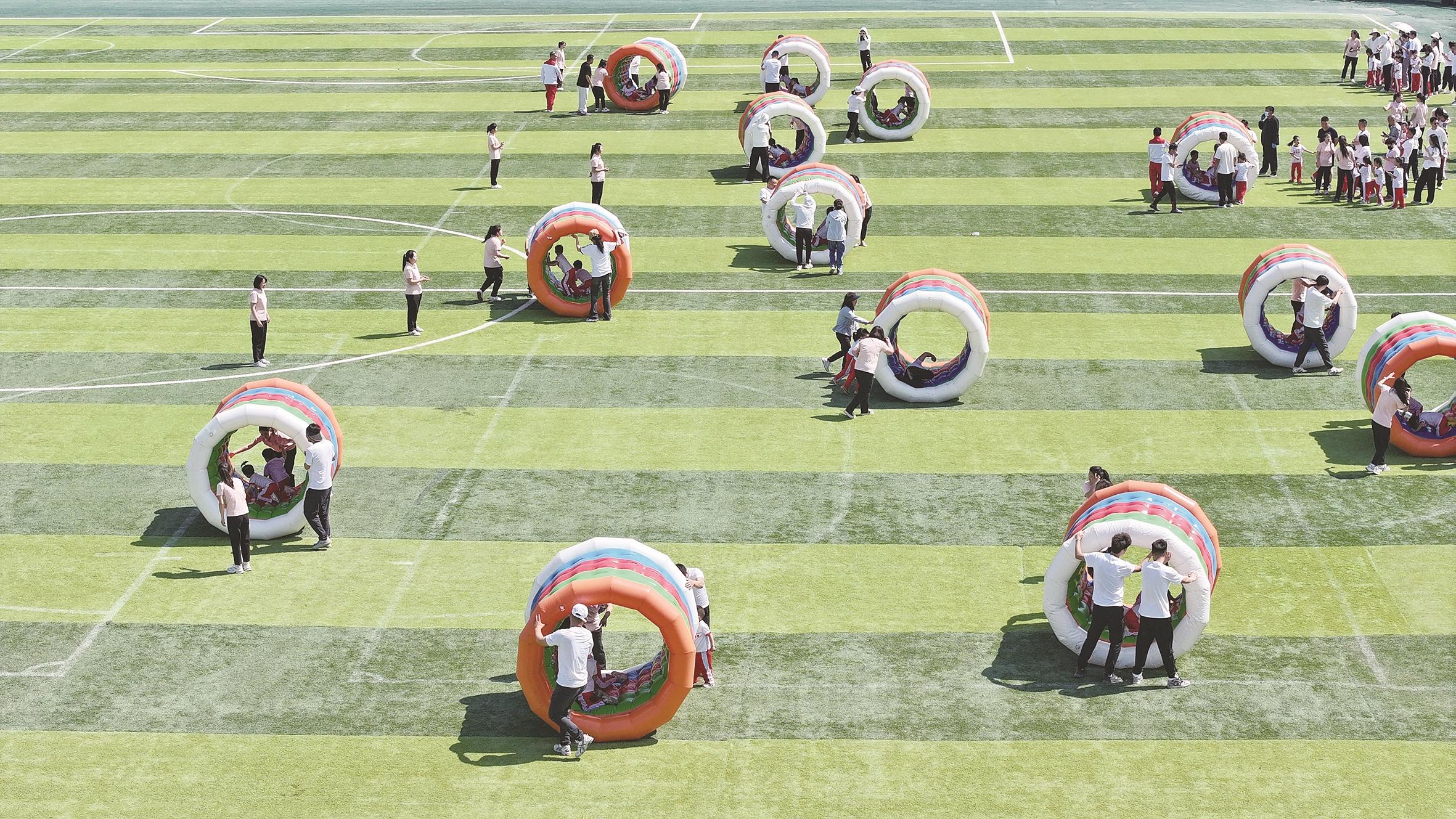 5月27日,家长与孩子们在活动中参与亲子游戏(无人机照片)。