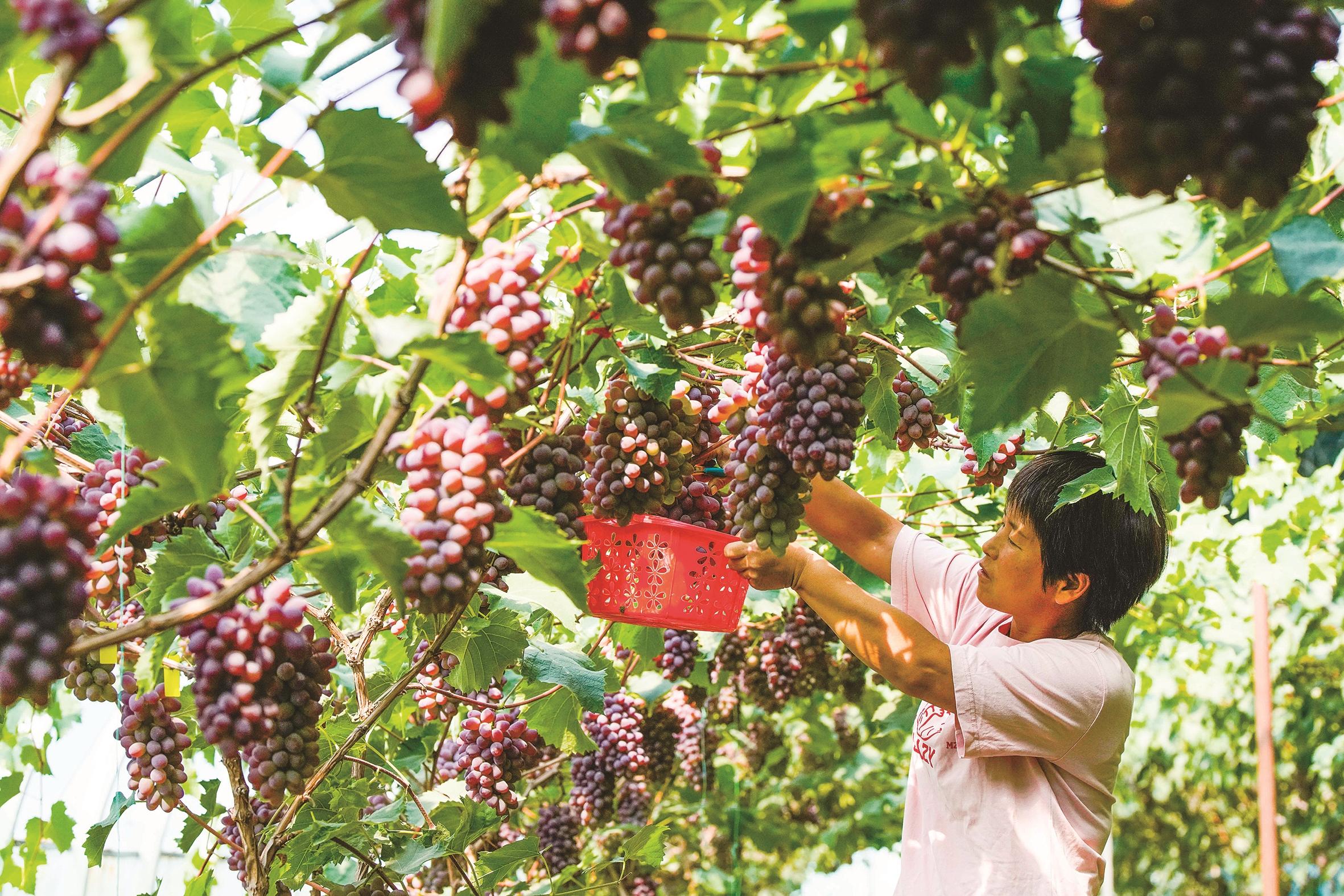 6月10日,河北省迁西县滦阳镇关姑寺村农民采摘葡萄。
