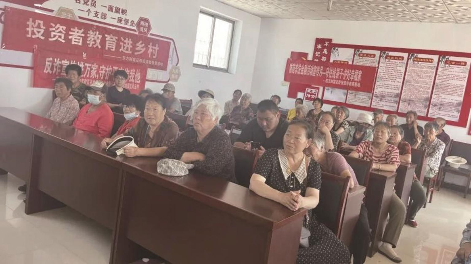 考虑到辖区老年群体是易受骗重点人群,服务站提前通过村微信群、村广播发布活动信息,邀约老年群体到场学习。活动现场,民政服务站与东方财富证券工作人员通过悬挂横幅、播放PPT以及发放《反诈手册》《老年人防骗指南》等宣传资料,吸引众多群众前来参与。