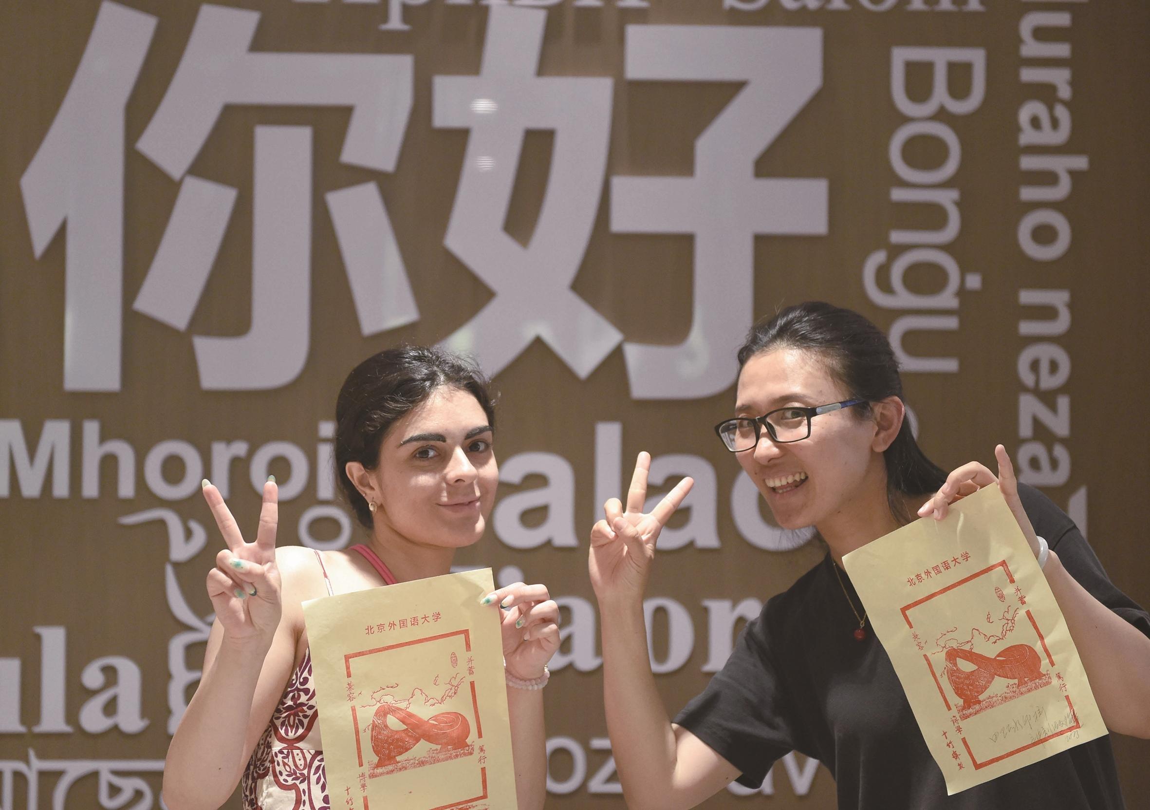 日前,北京外国语大学的意大利毕业生马芙蓝(左)与她的老师田卫卫一起展示她们制作的木版水印作品。
