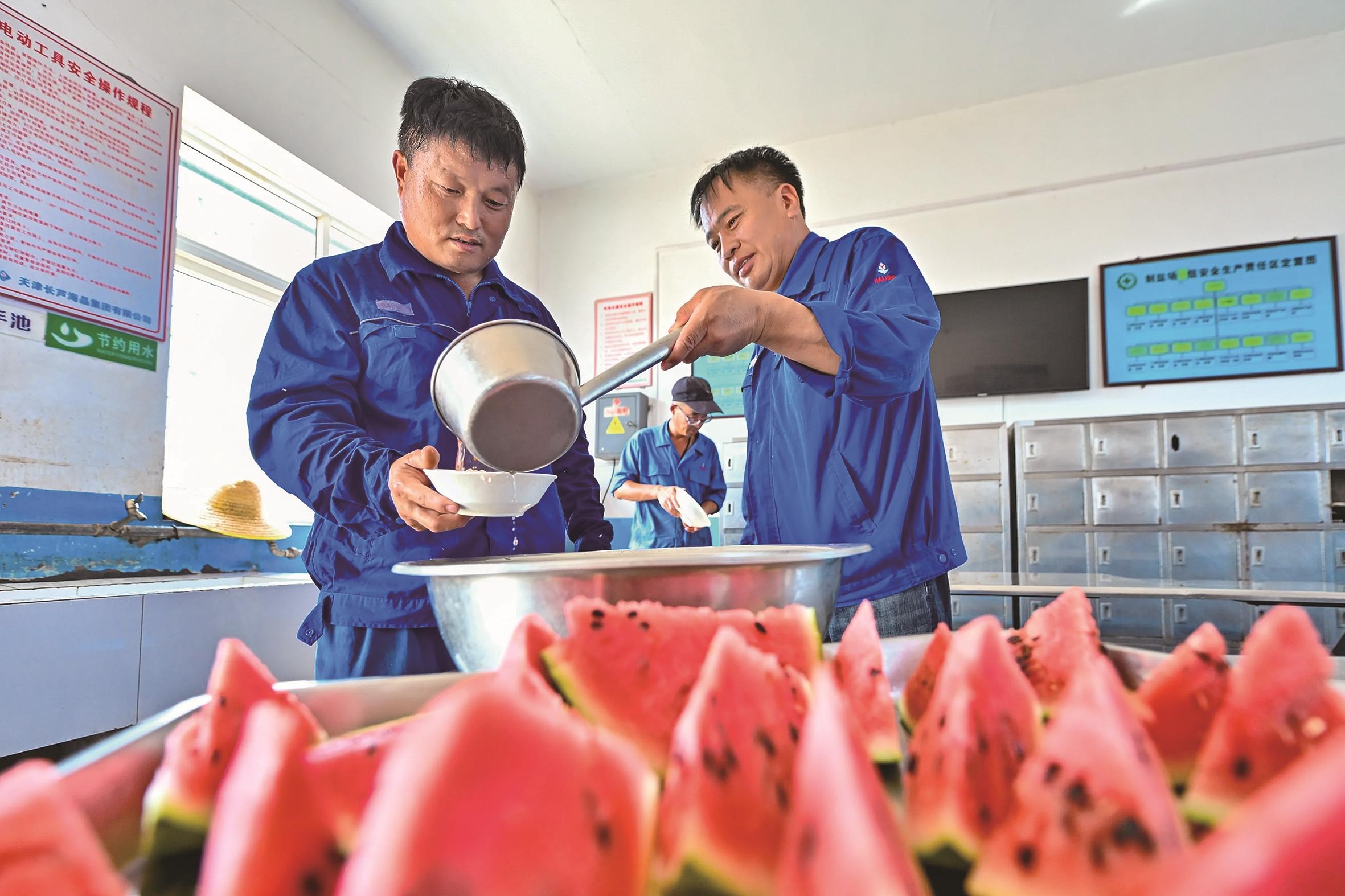 七月十三日,在天津长芦海晶集团有限公司的盐田作业现场,工人在休息区领取绿豆汤纳凉解暑。 眼下,我国华北、黄淮等地区持续高温,多地积极采取措施,保障群众生产生活。 新华社发(杜鹏辉 摄)