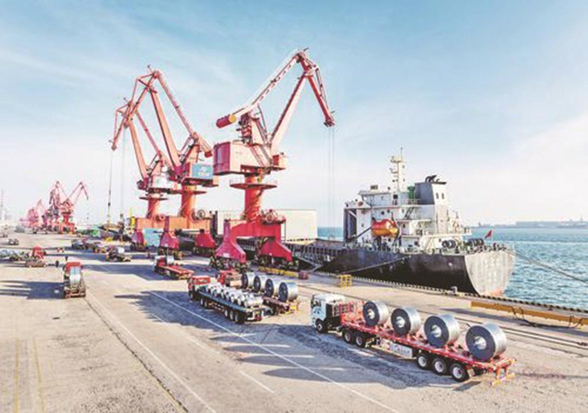 一台台高耸的塔吊舒展长臂,伸向茫茫天海。满载钢材的轮船徐徐离开首钢京唐公司码头,驶入海上钢材班轮航线。
