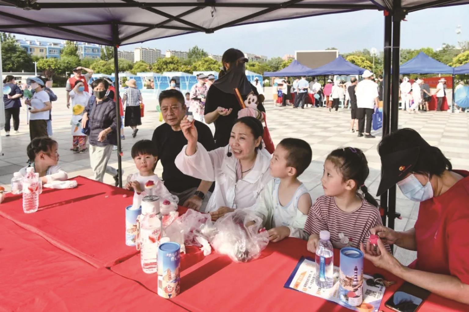 绿色邻里·公益集市热闹非凡,社区居民纷纷带上家中闲置物品,从书籍、玩具到手工艺品、花卉绿植应有尽有,大家“以诚易物”,实现了资源的循环利用。和谐邻里·便民服务区域人气爆棚,中医义诊、义务剪发、磨菜刀、自行车打气、衣物缝补等摊位排起了长队。艺享邻里·非遗润心区,家长和小朋友在非遗传承人的指导下现场体验面塑、芦苇画制作,沉浸式领略非遗魅力。