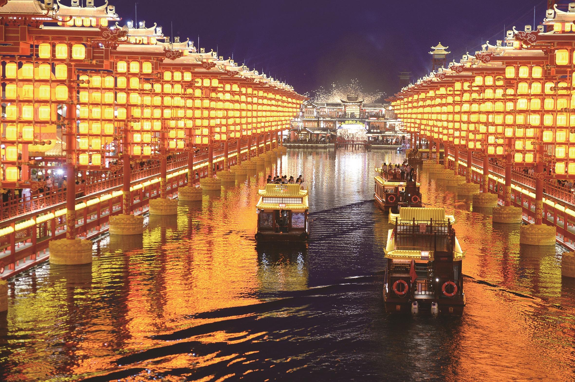 傍晚7点15分,近百盏唐风灯笼在唐山河头老街次第点亮,洒落一地金辉。飞天仕女衣袂翩跹,凌空起舞,漫天花雨倾泻;脚下明清风格的青砖灰瓦静静铺展。身着汉服的姑娘执扇走过石桥,孩童追逐花瓣,笑声在雕梁画栋间清脆回荡。空气里,糖画的甜香与烤栗子的焦香交织弥漫。这条1881年开凿的古老煤河,在水波光影中涅槃重生为“北方大唐不夜城”。
