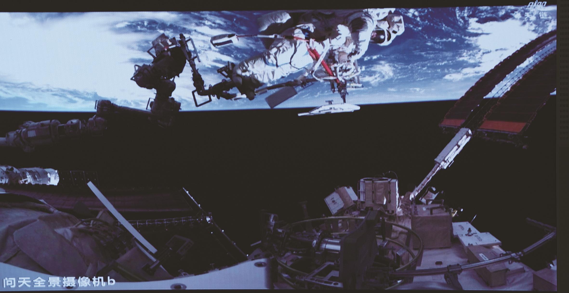 图为8月15日在北京航天飞行控制中心屏幕上拍摄的神舟二十号乘组航天员陈冬在舱外工作的画面。 新华社记者 厉彦辰 摄