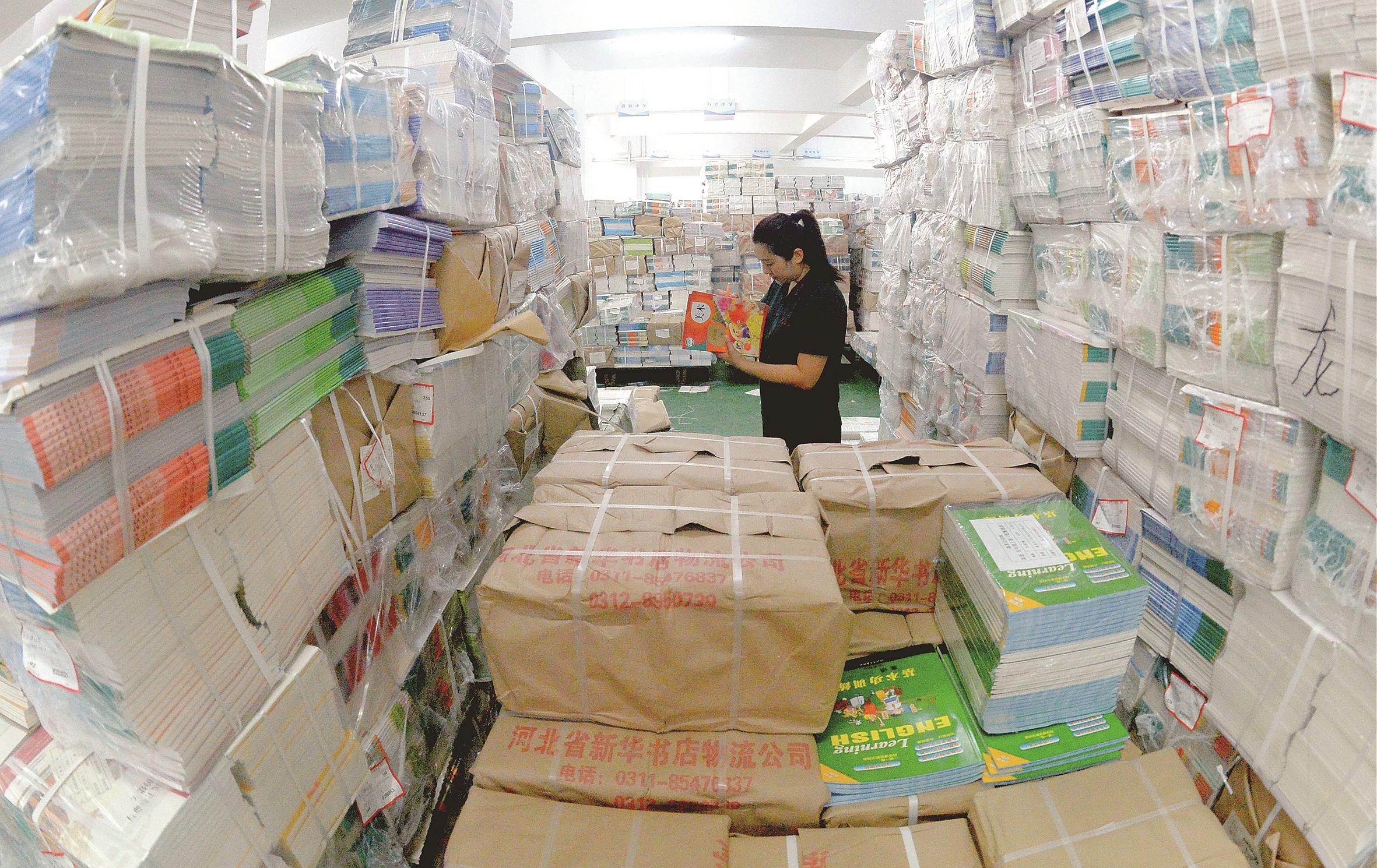 图为8月15日,市新华书店教学用书部工作人员在仓库清点教材。