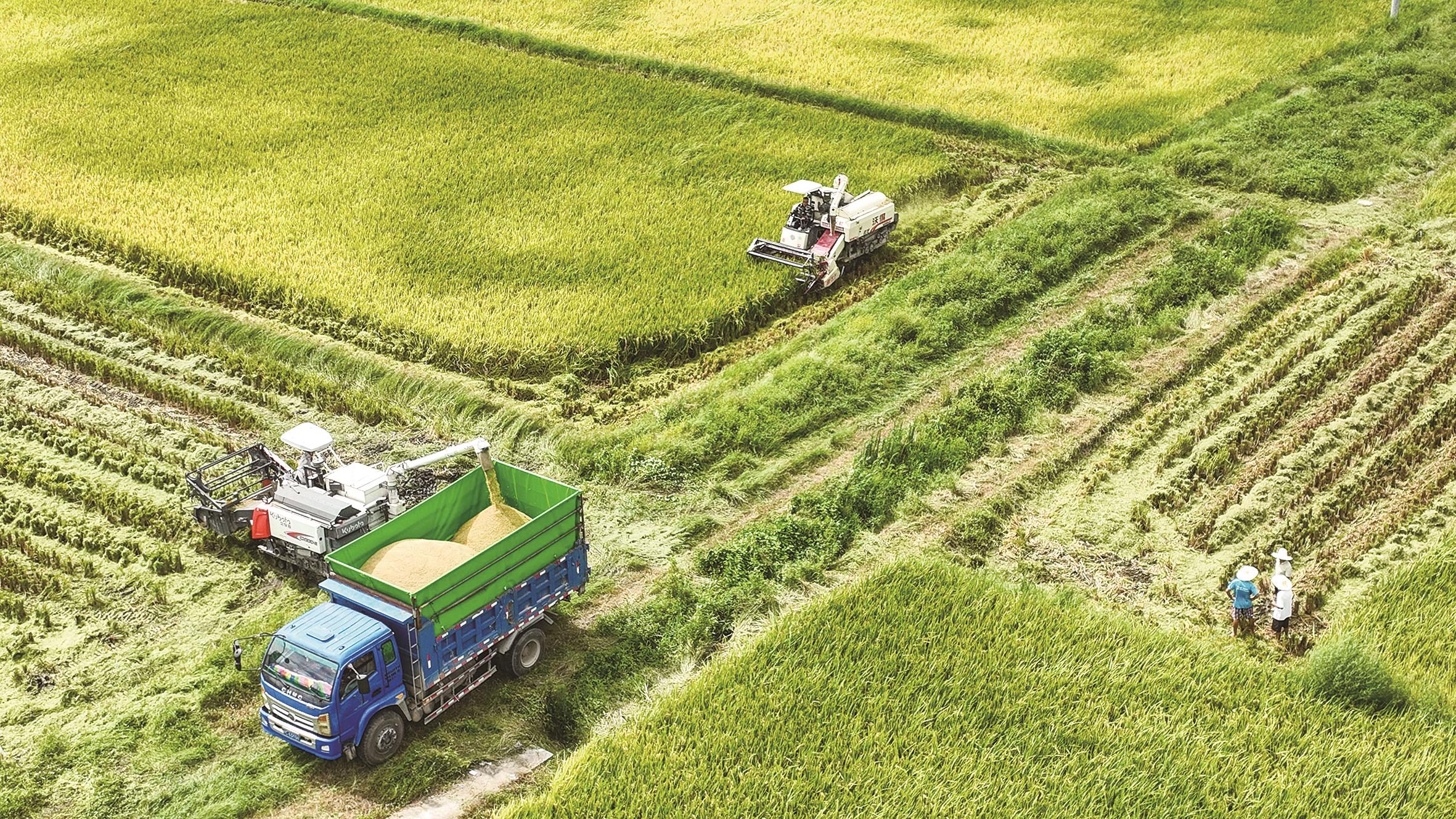 8月14日,在江西省宜春市袁州区寨下镇沙江村,农机手驾驶收割机在田间收割再生稻(无人机照片)。
