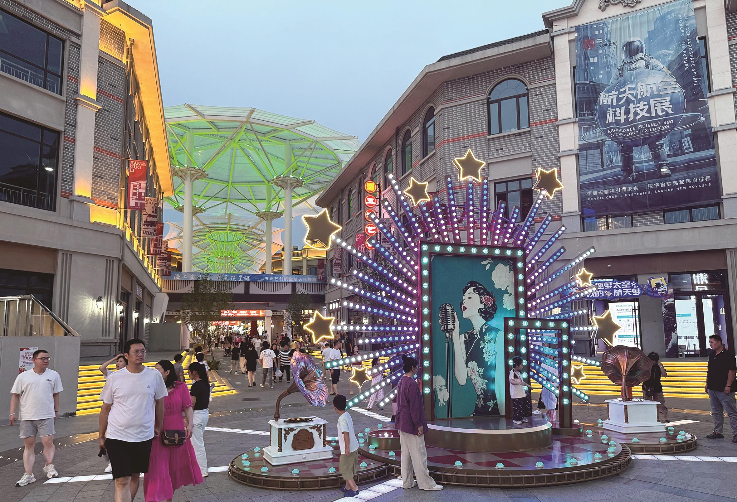 改造后的建国里占地100亩,建筑面积5.6万平方米,对标3A级旅游景区标准,整体规划有特色市集、主题展览、艺术策展等部分,打造出标志性天幕、特色美陈、无动力装置等硬件设施,增强街区艺术性与打卡属性,成为展现城市形象的新名片。