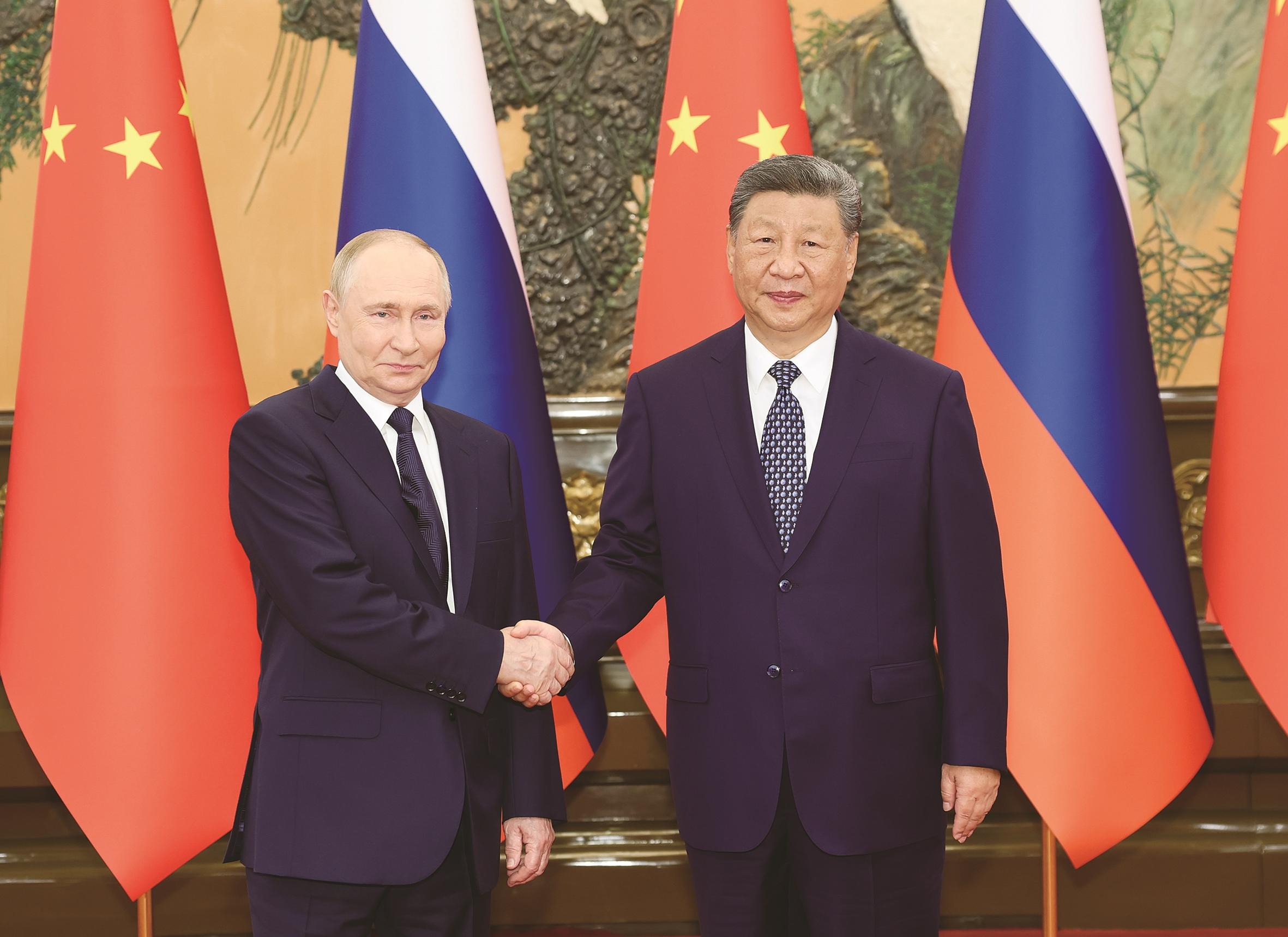 习近平指出,中俄两国元首相互出席对方国家举办的纪念世界反法西斯战争胜利庆典,充分彰显了作为第二次世界大战主要战胜国和联合国安理会常任理事国的大国担当,展示了维护二战胜利成果、捍卫正确二战史观的坚定决心。我提出全球治理倡议,就是要会同所有志同道合国家,坚定捍卫联合国宪章宗旨和原则,推动建设更加公正合理的全球治理体系。中俄两国都强调主权平等、国际法治、多边主义,要继续在联合国、上海合作组织、金砖国家、二十国集团等多边平台加强协作,携手推动构建人类命运共同体。