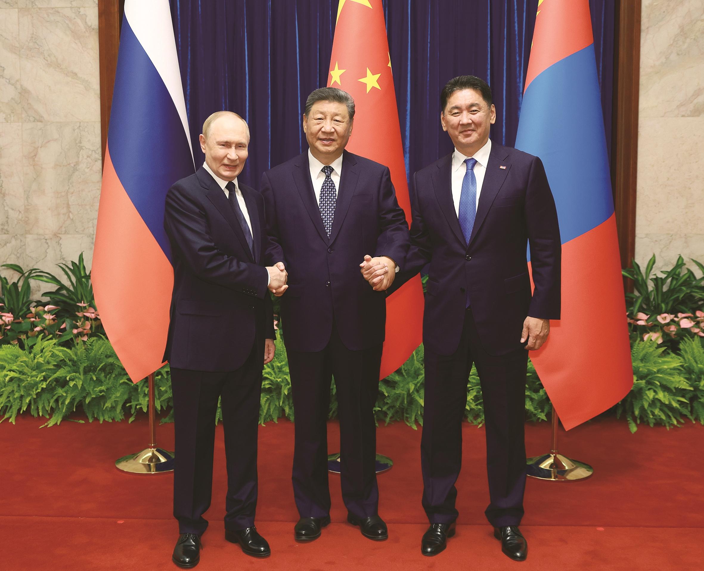 新华社北京9月2日电 (记者孙奕、马卓言)9月2日上午,国家主席习近平同俄罗斯总统普京、蒙古国总统呼日勒苏赫在北京人民大会堂举行中俄蒙三国元首第七次会晤。