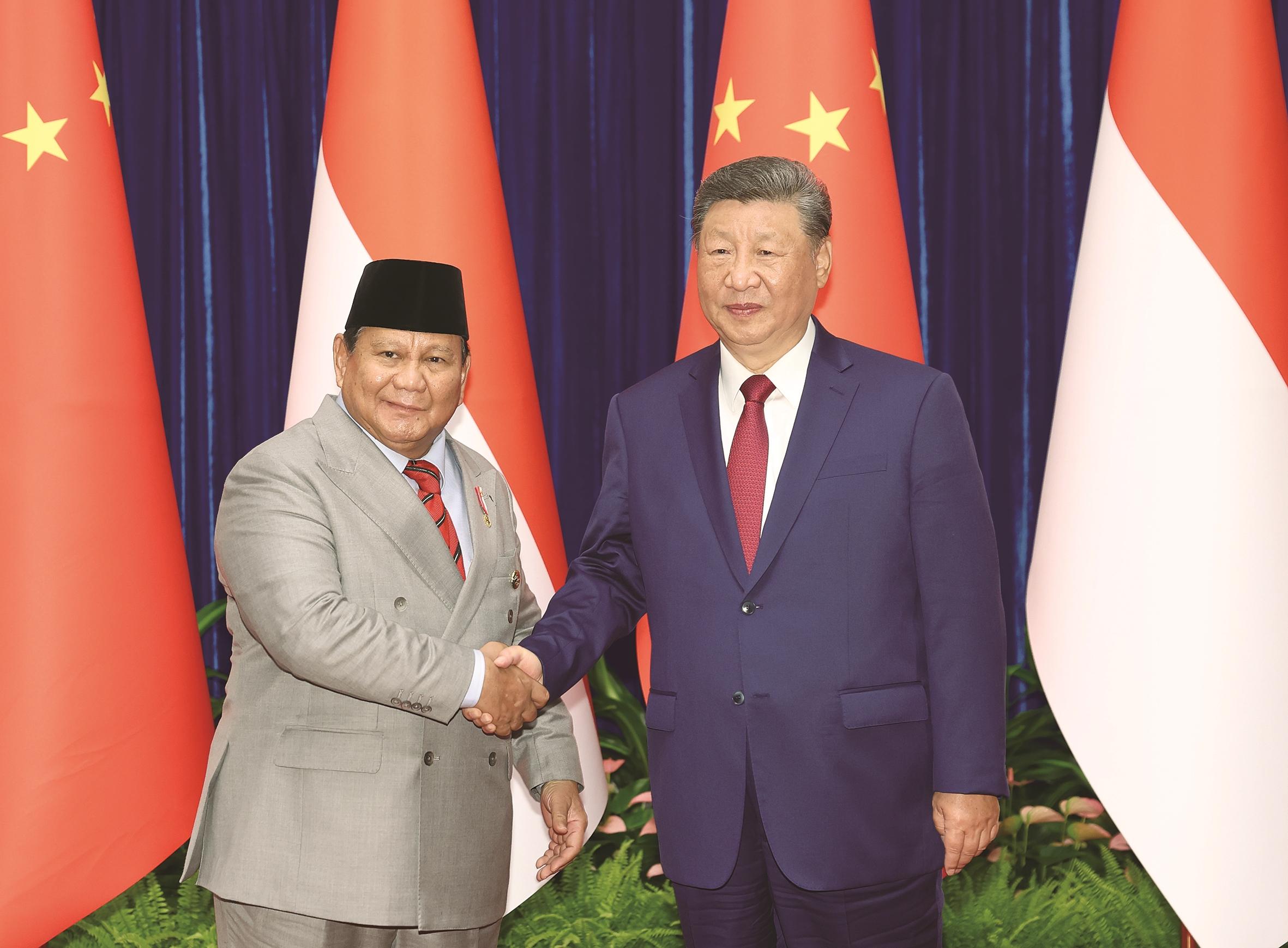 9月3日下午,国家主席习近平在北京人民大会堂会见专程来华出席纪念中国人民抗日战争暨世界反法西斯战争胜利80周年活动的印度尼西亚总统普拉博沃。 新华社记者 黄敬文 摄
