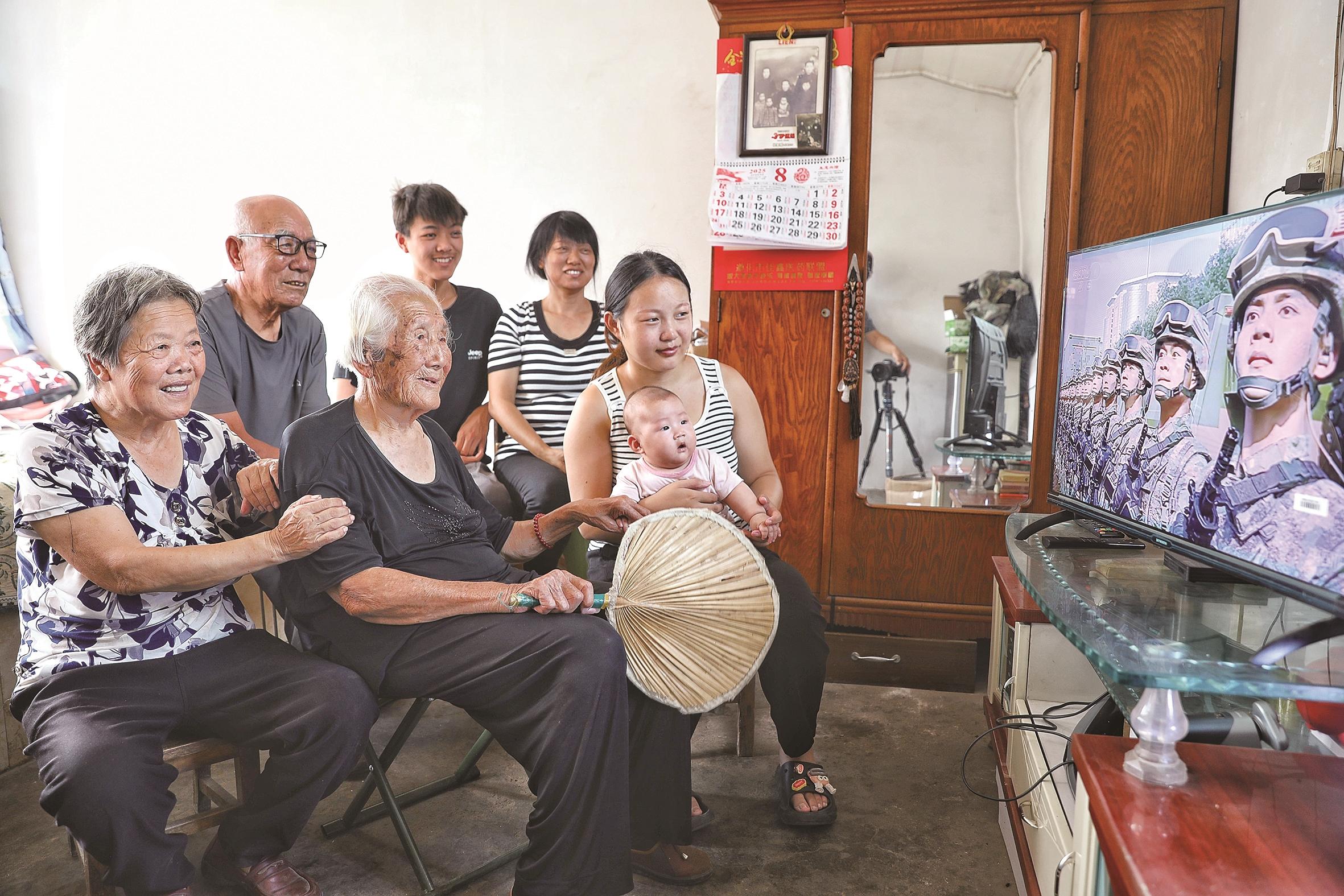 遵化市东旧寨镇大寨村102岁的张素珍,如今已五世同堂。9月3日,她召集在家的晚辈,一起收看了纪念抗战胜利80周年阅兵式。忆往昔峥嵘岁月,看今朝幸福生活,全家人为祖国的强大倍感自豪。 王瑞娟 摄