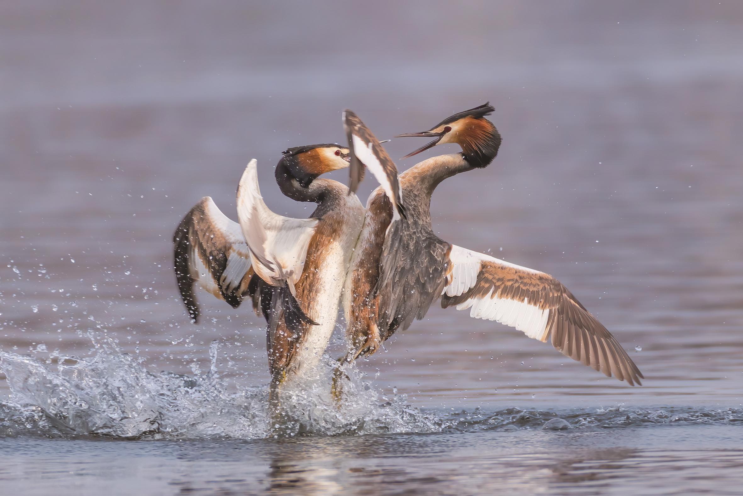 凤头鸊鷉看似貌不惊人,但一旦恋起爱来,仿佛换了个角色——它们的冠羽会蓬松或炸起来,但不是怒发冲冠那种,而是仿佛戴了一个美丽的花冠。雄性追求雌性,有时身体会在水面上突然摆弄出莲花的形状,层层怒放着,观鸟爱好者们称之为翻花或形象地比喻成“穿袍”“脱袍”。这时候,要特别留意另一只会从翻花的这只身边猛地钻出来,低头含胸的样子,开始互动,非常漂亮。如果中意对方,雄雌之间便会相对而视,含情脉脉,摇动头颈。摇头时间一久,倘若两只鸟背对背同时或相继入水,一会儿各自衔起一把水草时,它们就会急急地往一块儿凑直身子高高地挺起互撞,这叫撞胸,撞胸的激烈程度取决于双方拉开的距离有多远、各自叼的水草是多是少,距离越远、水草越多,应该越激烈,水花四溅。撞胸后,它们会继续摇头晃脑,以示很快乐。堪称一套非常完整的优美的漂亮的爱情舞蹈动作。