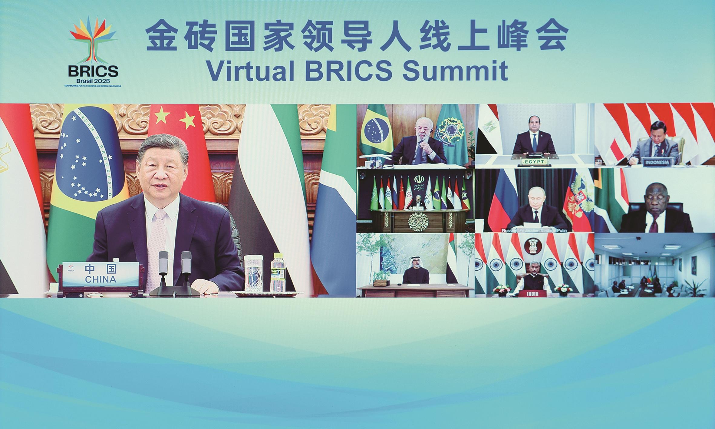 第三,坚持团结合作,凝聚共同发展合力。金砖国家人口占世界近一半,经济总量约占世界30%,贸易总额占世界五分之一。金砖国家合作越紧密,应对外部风险挑战的底气就越足、办法就越多、效果就越好。中方愿同其他金砖国家一道,落实全球发展倡议,推进高质量共建“一带一路”,发挥各自优势,深化务实合作,在经贸、金融、科技等领域打造更多合作成果,让“大金砖合作”基础更牢、动能更足、影响更大,更多更好惠及各国人民。(讲话全文见二版)