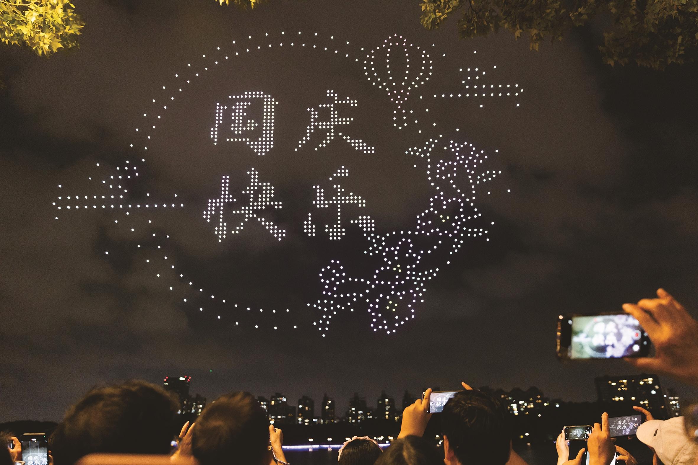 当晚,“世纪璀璨——无人机灯光秀”表演在上海世纪公园举行,1000架无人机在世纪公园镜天湖上空组成“国庆快乐”“盛世华诞 家国同庆”“浦东欢迎您”等字样和玉兰、荷花、梅花等花卉图案,在国庆假期即将到来之际,为市民游客献上一场视觉盛宴。