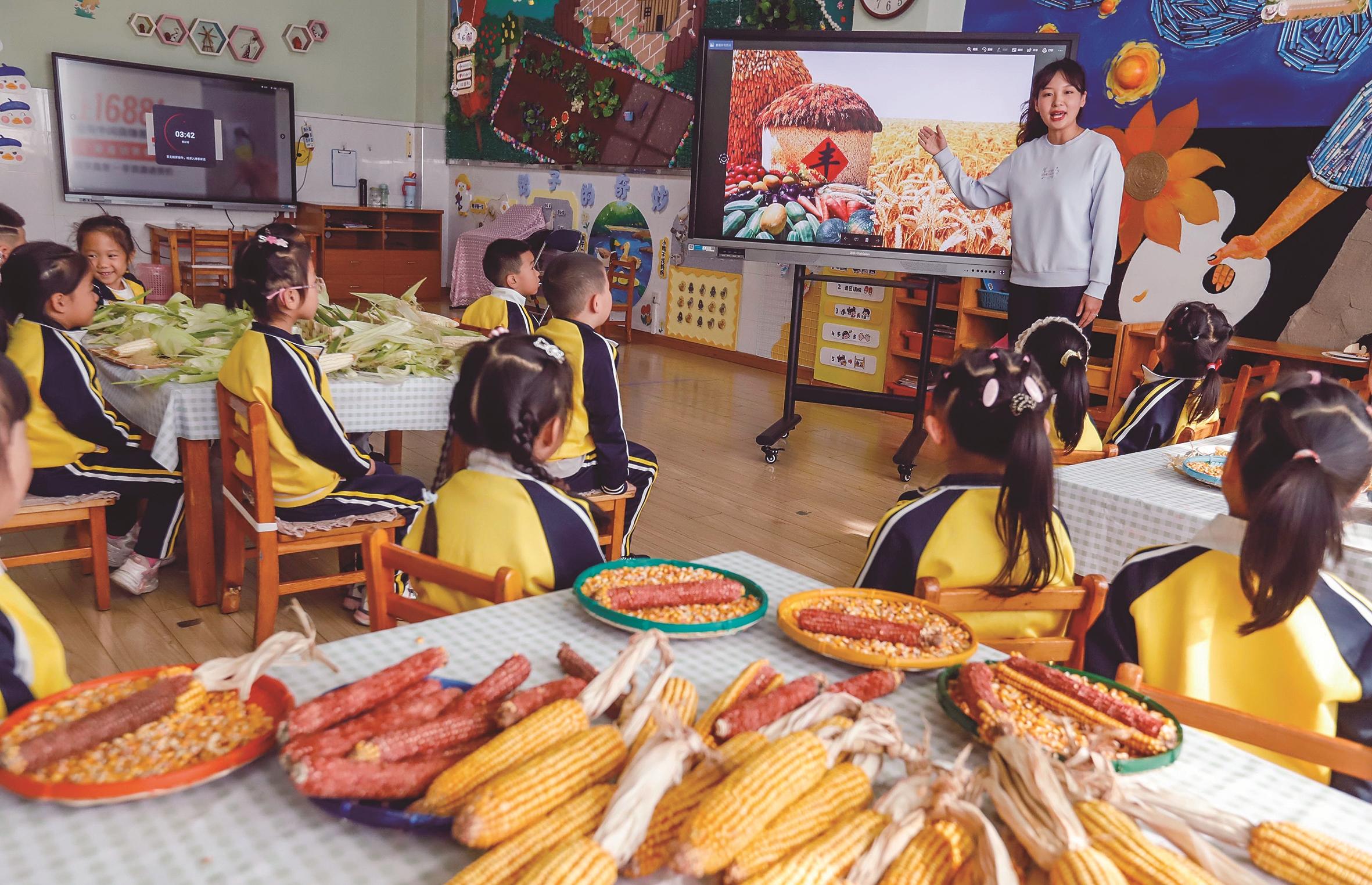 10月14日,河北省唐山海港经济开发区幼儿园老师对小朋友进行珍惜粮食教育。