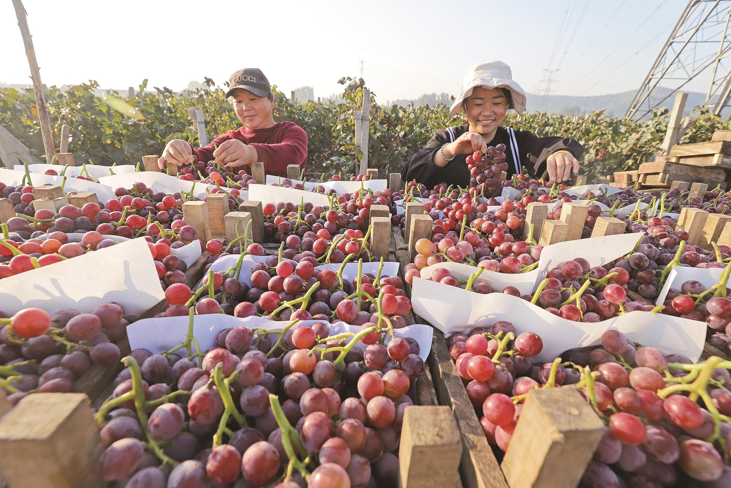 近日,玉田县林头屯乡葡萄种植基地1500余亩葡萄进入成熟采摘期,农民们正忙着采摘、筛选、装运,供应市场。