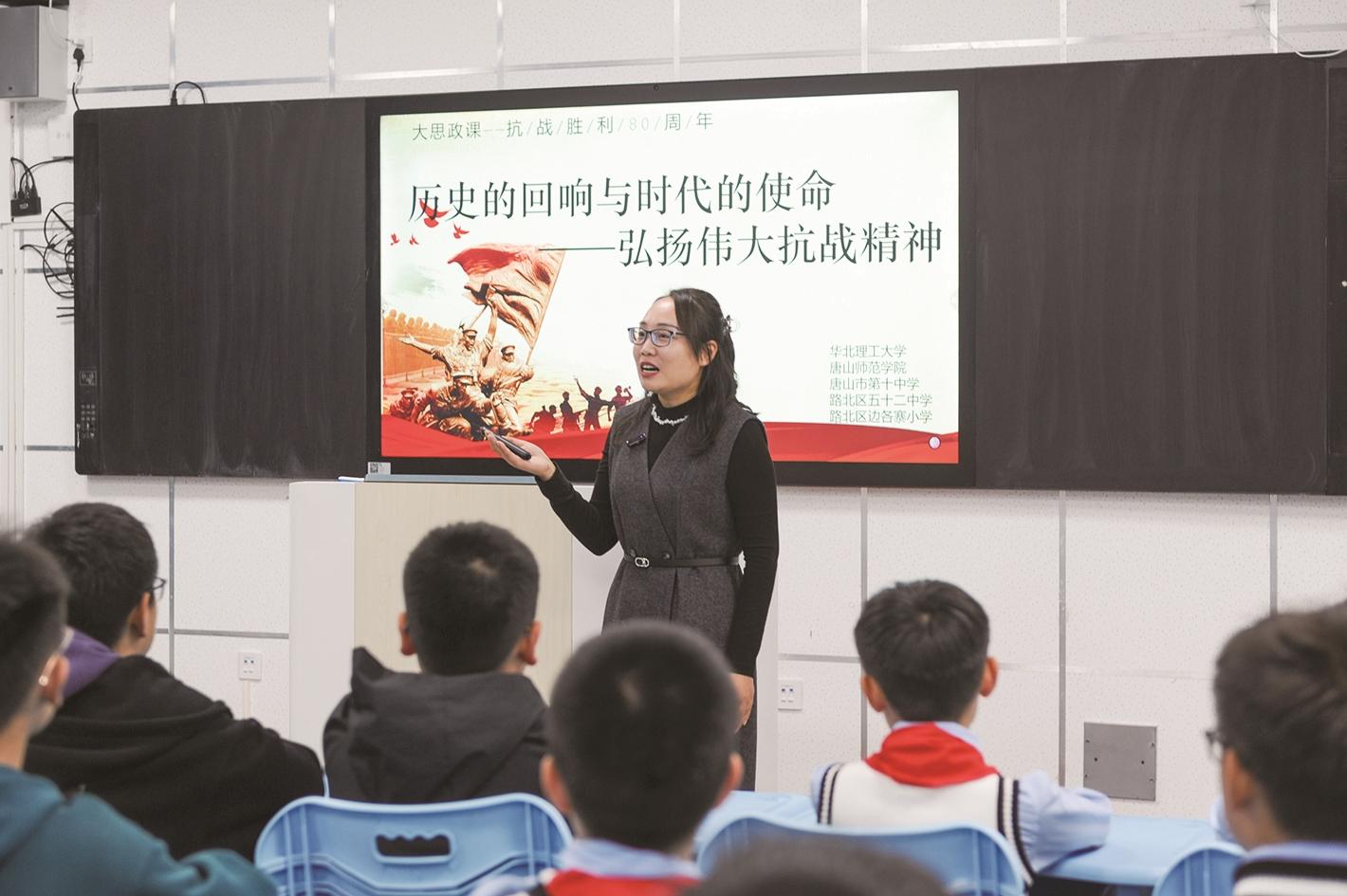 本报讯 (王楠)在历史与现实的交响中,唐山十中以一场别开生面的跨校联合思政课,奏响了弘扬伟大抗战精神的强音。近日,该校启智楼录播教室变身历史课堂,来自华北理工大学、唐山师范学院、路北区五十二中学及边各寨小学的百余名师生齐聚一堂,共同参与由唐山十中承办的“历史的回响与时代的使命——弘扬伟大抗战精神”主题思政课。