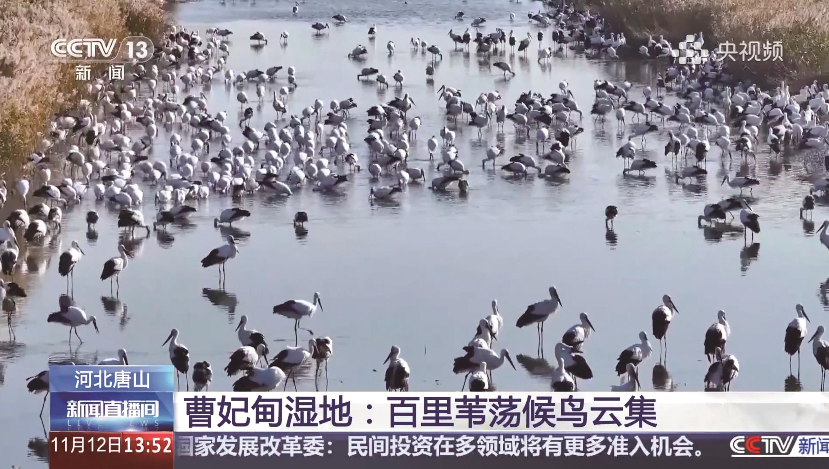 11月12日,央视《新闻直播间》播出《河北唐山 曹妃甸湿地:百里苇荡候鸟云集》。初冬时节曹妃甸湿地迎来候鸟迁徙高峰,近百万只候鸟在此休整觅食。近年来,曹妃甸持续加大湿地保护力度,通过退渔还湿、生态修复等举措为东方白鹳等珍稀鸟类提供了可以依赖的“生态驿站”。